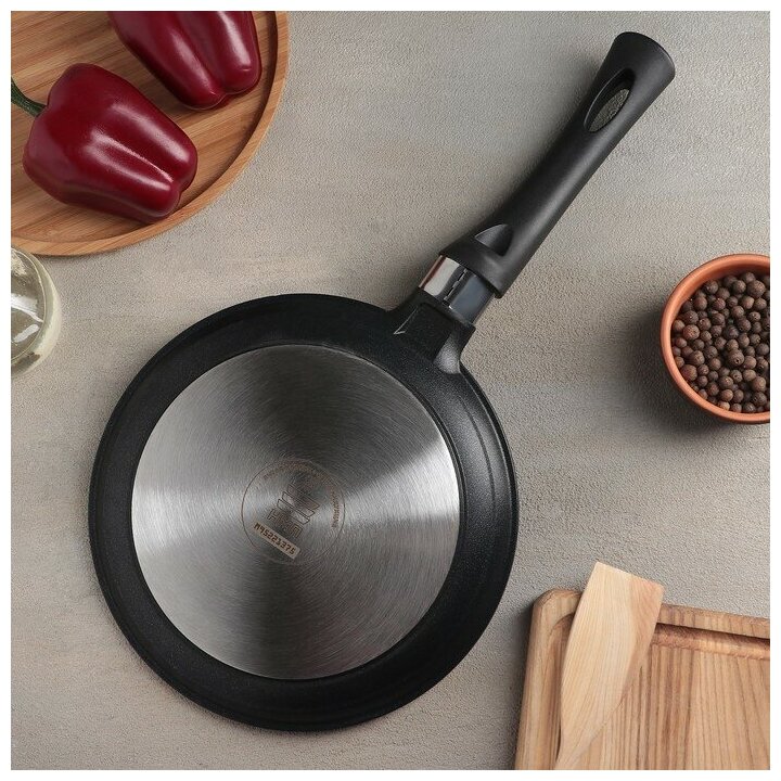 НМП сделает процесс выпекания блинов максимально комфортным и простым. Благодаря длинной ручке, низкому борту и толстому антипригарному покрытию так легко переворачивать и снимать блины. Утолщенное дно с полностью магнитной поверхностью делает сковороду идеально подходящей для использования на индукционных варочных панелях, обеспечивает особые термоаккумулирующие свойства, блины равномерно пропекаются по всей толщине, красиво румянятся с обеих сторон и приобретают отменный вкус.