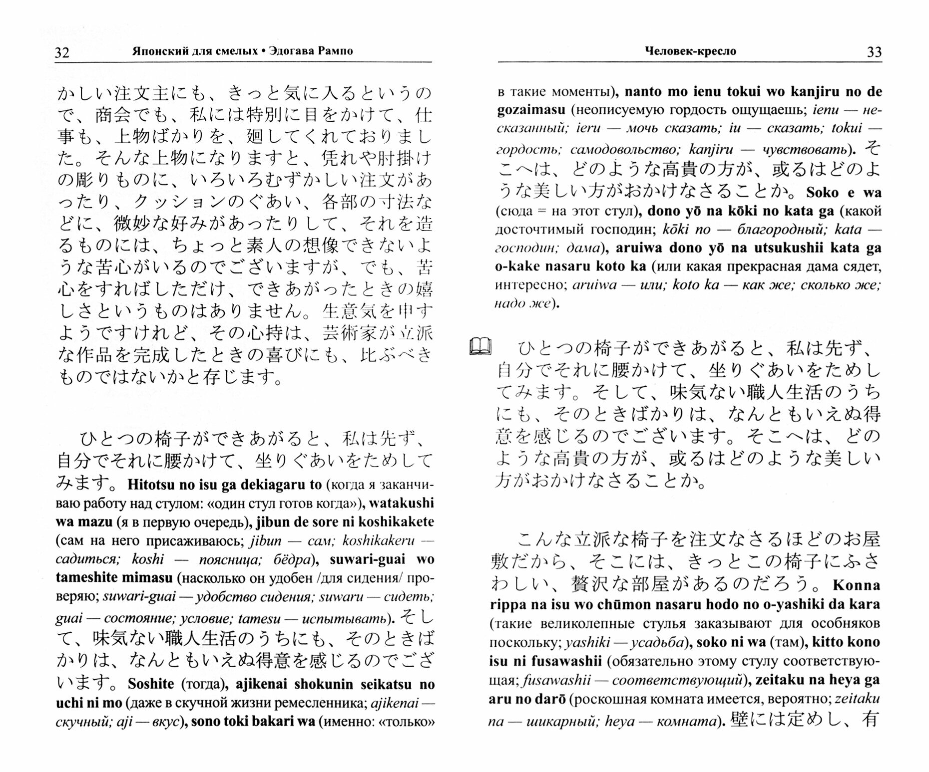 У этой книги есть очень весомый минус, который в принципе убивает весь смысл её прочтения - отсутствие чтения иероглифов. Точнее чтение то есть, но оно дано только в виде романзи. По-факту приходиться читать не по японски, а через транскрипцию, времени самому подумать и перевести попросту нет, поскольку перевод впритык к транскрипции. Единственный плюс только в наличие неадаптированного текста, но он в занимает максимум треть.