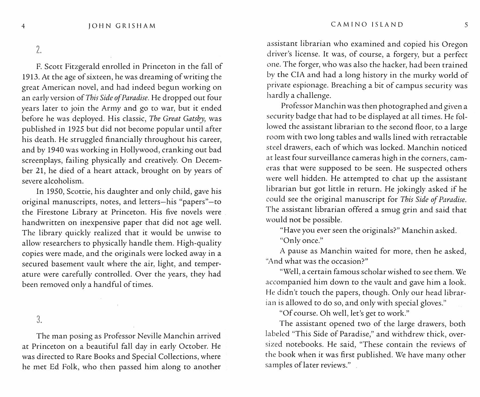 Команда разрабатывает план по краже оригинальных рукописей Ф. Скотта Фицджеральда, находящихся в Принстонском университете. Довольно сложный план, и когда в нем возникнут неровности, кто сохранит свое согласие не сдавать остальных. После того как рукописи украдены, их приходится скрывать, чтобы получить выкуп. Интригующий план со множеством неожиданных поворотов. Увлекательное чтение.