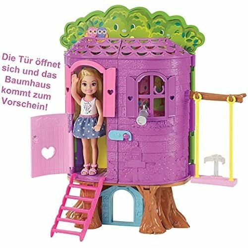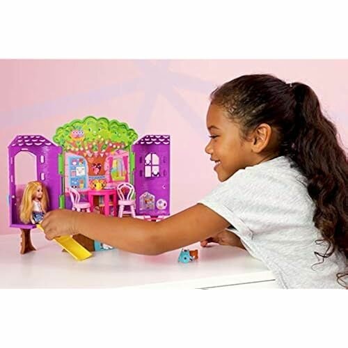Челси и ее щенок готовы принять гостей в своем домике на дереве. В этом красочном наборе два уровня и множество игровых зон. Домик расположился в окружении ветвей и листьев. В стволе дерева есть маленьких домик для очаровательного щенка Челси. Снаружи стоят качели, на которых Челси может позагорать. Открой двери и загляни внутрь домика. Сколько там всего! Отправляйся вверх по выдвижной лестнице прямо в игровую комнату и наблюдай за звездами из окна. В центре есть гардеробная с туалетным столиком. За ним скрываются маскарадные маски. В столовой есть стол, стул и идеальное место для блюда с пирожными. В домике даже есть горка, по которой можно весело скатиться вниз. Челси в повседневном наряде и обуви готова провести там целый день.
