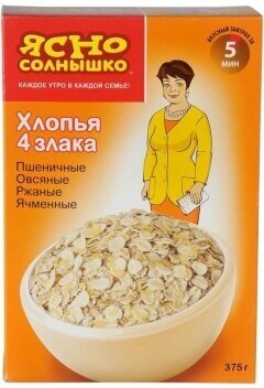 - Ясно Солнышко хлопья 4 злака: хлопья пшеничные, овсяные, ржаные, ячменные требующие варки.