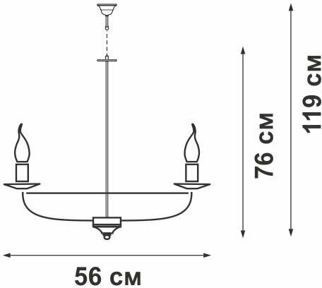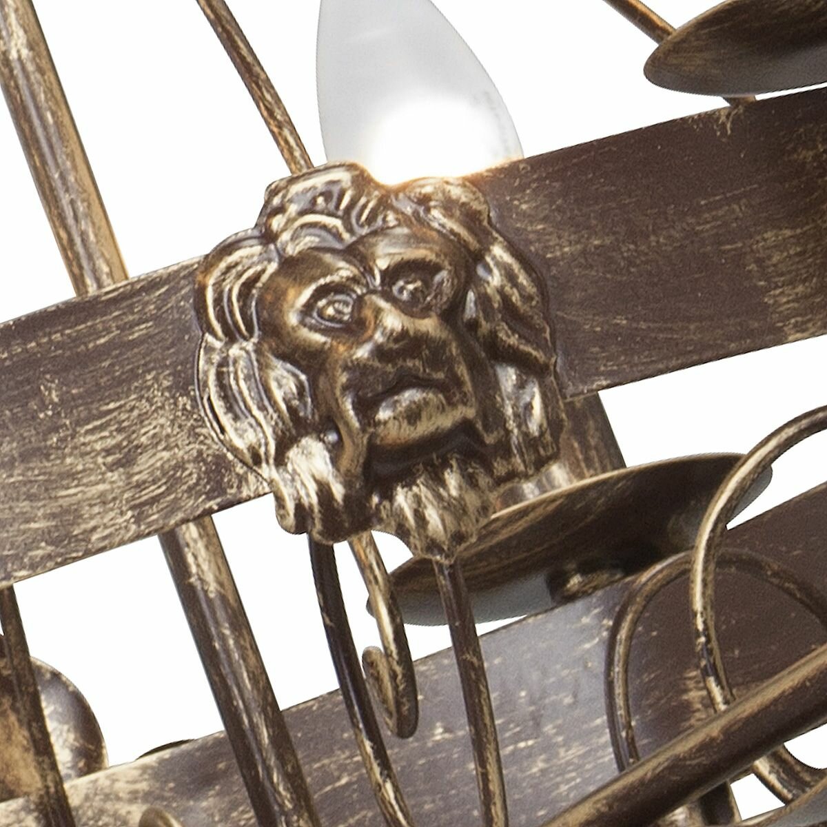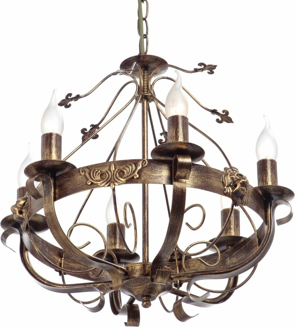 Металлическая конструкция выполнена в красивом коричневом оттенке, дополнена декоративными элементами в старинном стиле. Плафоны у данной модели отсутствуют. Подвес регулируется по высоте, поэтому подойдет для установки в помещениях с высокими и стандартными потолками. Материалы высокого качества.