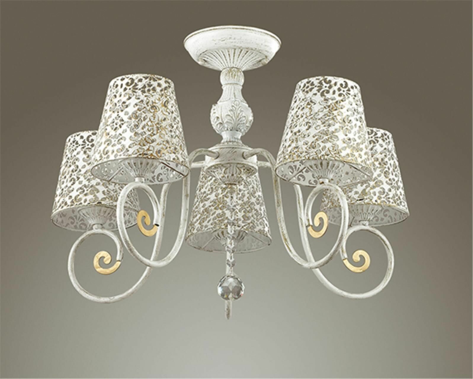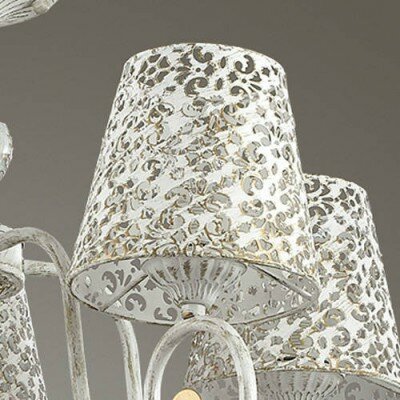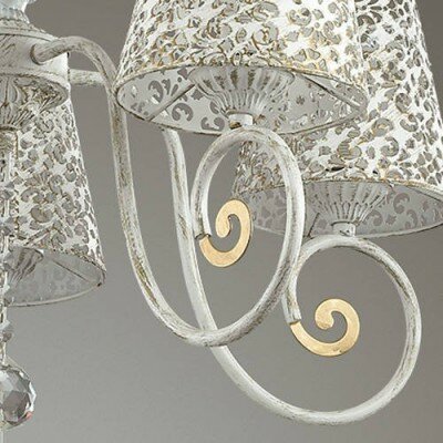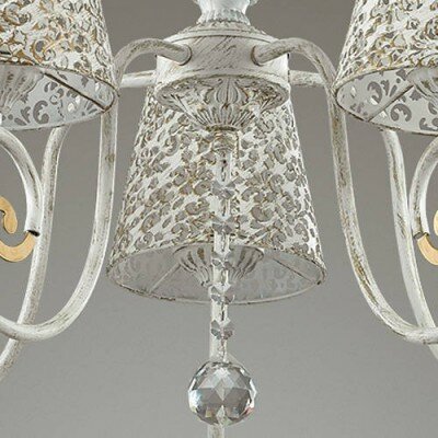 Конструкция выполнена из металла белого цвета, дополнена декоративными элементами из стекла и золотистыми вставками. Плафоны конусовидной формы изготовлены из металлического сплава. Поверхность белого цвета покрыта узорным орнаментом цветочной тематики. Люстра красиво рассеивает свет, наполняя комнату мягким свечением. Для данной модели используют лампы накаливания. Люстра используется в помещениях со средней высотой потолка. Служит на протяжении длительного срока, без потери первоначальных характеристик.