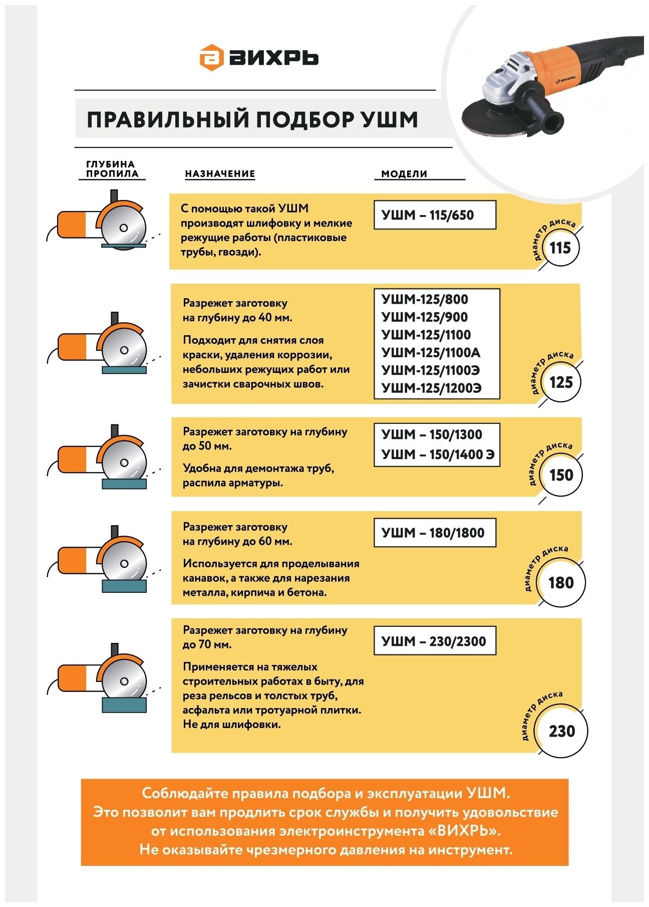 Вихрь - надежная УШМ, широкий функционал которой может оценить каждый. Удобная прорезиненная ручка не даст соскочить инструменту и при этом обеспечит комфортный хват в руке. А крепкий корпус и надежная сборка обеспечат долговременную работу УШМ. В модели предусмотрено использование шлифовальных кругов диаметром до 125 мм, что вполне достаточно для бытового использования инструмента.