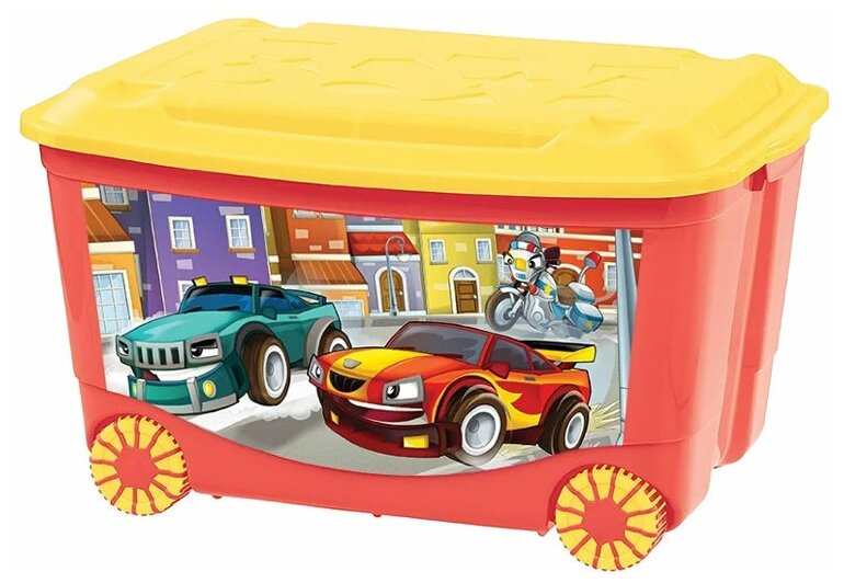 Яркий и оригинальный ящик на колесах отлично впишется в детскую комнату и станет незаменимым для хранения игрушек, книжек и других детских принадлежностей. Дизайн и цветовая гамма делают ящик игрушкой: его можно использовать как домик, машинку, такси, стол и т. д. Двухцветные колеса ящика покрыты специальным эластичный материалом, который увеличивает устойчивость и снижает шум при соприкосновении с различными напольными покрытиями. Имеются удобные ручки для переноски, а также специальные отверстия, через которые можно продеть веревку (в комплекте), чтобы ребенок мог легко передвигать его. Крышка ящика декорирована геометрическими фигурами. Конструкция замков позволяет фиксировать крышку, что препятствует попаданию пыли, влаги и т.д.