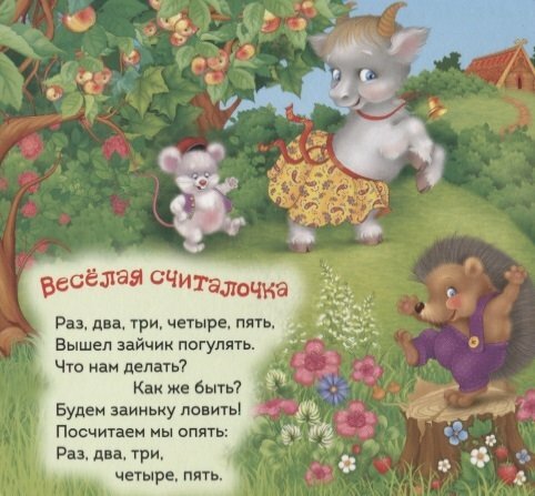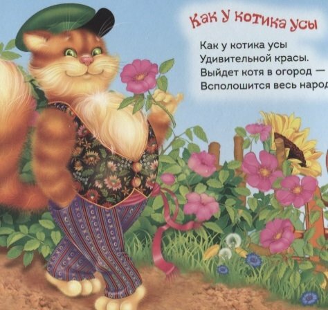 В книжку вошли русские народные потешки: «Идет коза рогатая», «Сорока-белобока», «В нашей деревне», «Как у котика усы», «Веселая считалочка».
