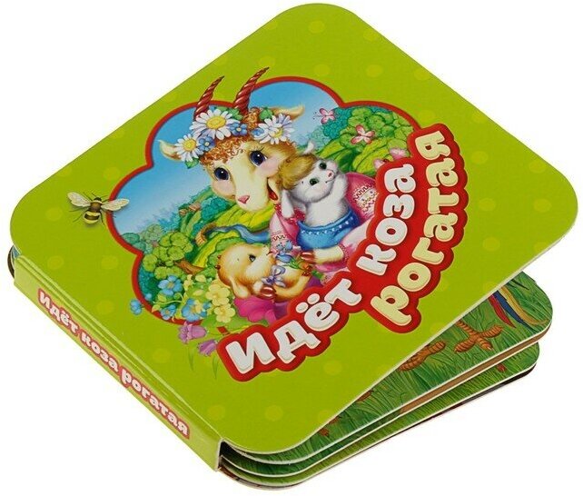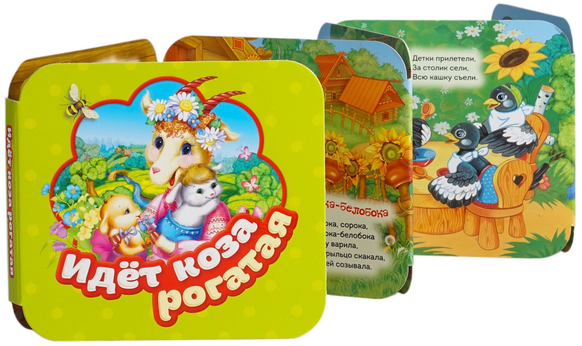 Эта серия книжки-гармошки вообще очень удачная. Причём на возраст почти с рождения и лет до 3-4! А именно эта «Идёт коза рогатая» вообще лучшая из веселых потешек в данной серии. Здесь большее количество известных всем с детства стихотворений. Иллюстрации как и в других книгах-гармошках яркие, хотя мне не особенно нравятся эти животные в странной человеческой одежде.