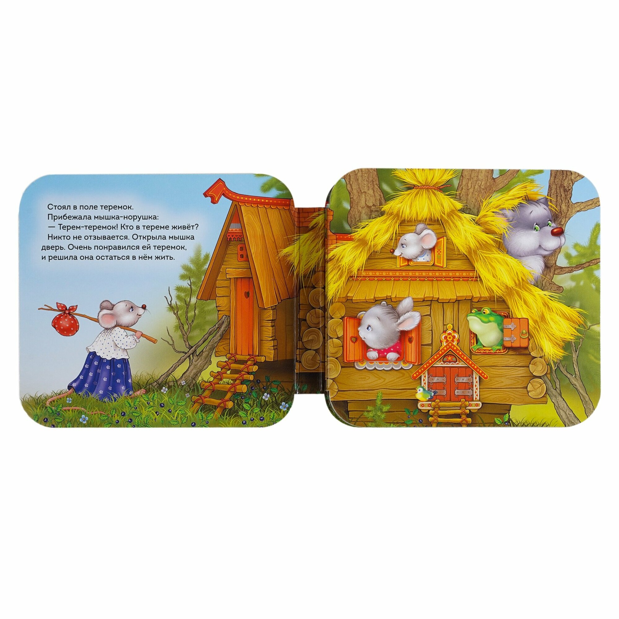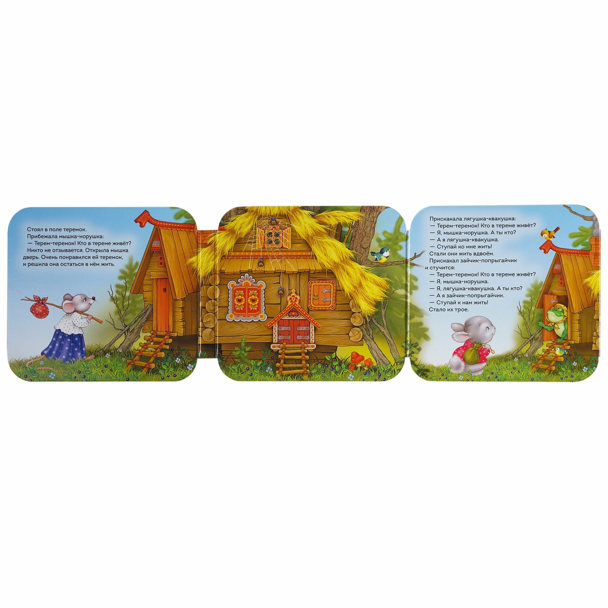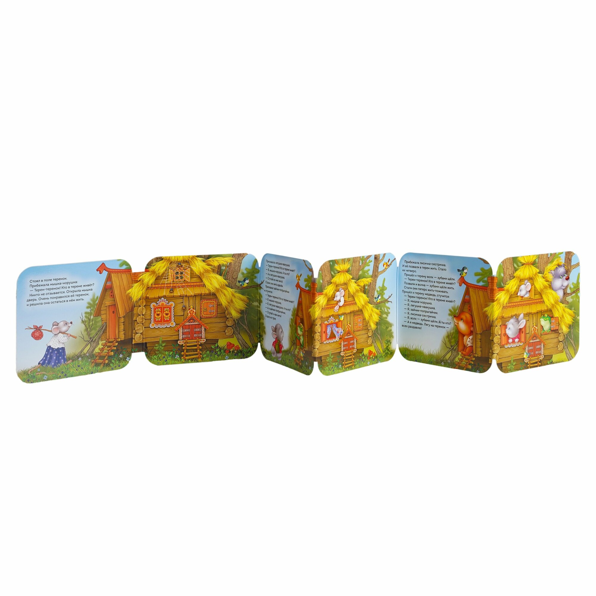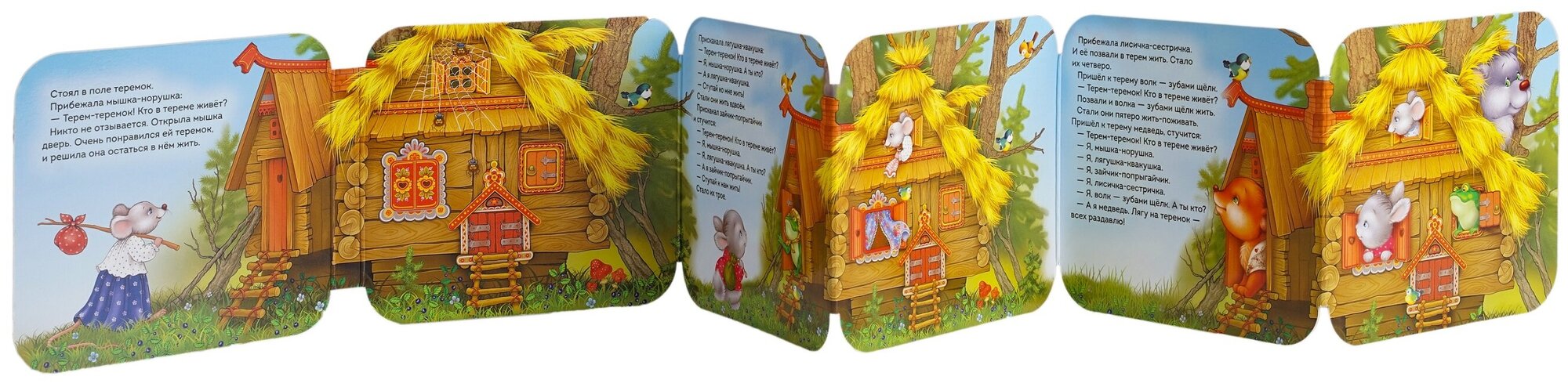 Одна из самых любимых наших книжек про всем известную сказку Теремок. Купили, когда малышу было несколько месяцев, и вот уже больше года она наша любимая среди прочих. Читаем несколько раз в день. Ребёнок часто берет её сам, рассматривает, показывает на героев сказки, бормочет на своём. Уже выучили наизусть. Плюс интересный формат книги в виде гармошки