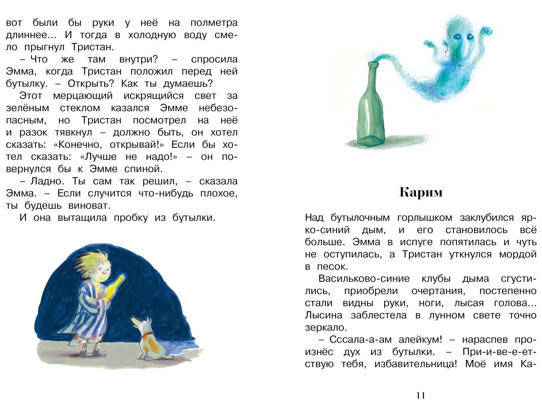 Добрая и немножко наивная история о маленькой девочке, живущей с семьей на берегу моря и слегка подуставшей от братьев. Однажды ночью, прогуливаясь по берегу, любуясь луной и размышляя о жизни (чему похоже поспособствовало громкое сопение одного из братьев, не дававшее ей уснуть) Эмма со своим псом вылавливают бутылку с джинном. У синего парня проблема и добрая девочка решает помочь. Осторожно, мечты под луной иногда сбываются. Текст чуточку попроще и полегче экранизированных вариантов. Картинки цветные и мягкие.