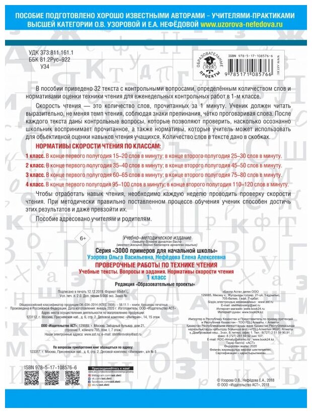 Проверочные работы по технике чтения. 1 класс. Учебные тексты вопросы и задания нормативы скорости чтения. (Елена Алексеевна Нефедова, Ольга Васильевна Узорова); АСТ, 2021