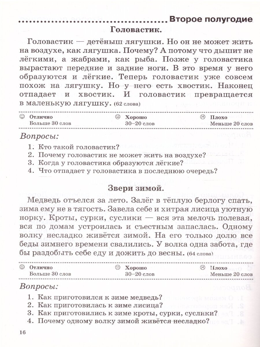 Скорость чтения - это количество слов, прочитанных за 1 минуту. Ученик должен читать выразительно, не меняя темп чтения, соблюдая знаки препинания, четко проговаривая слова. После каждого текста даны контрольные вопросы, которые позволяют проверить, насколько осознанно школьник воспринимает прочитанное, а также нормативы, которые учитель может использовать для объективной оценки навыков чтения учащихся. Количество слов в текстах дано в скобках.