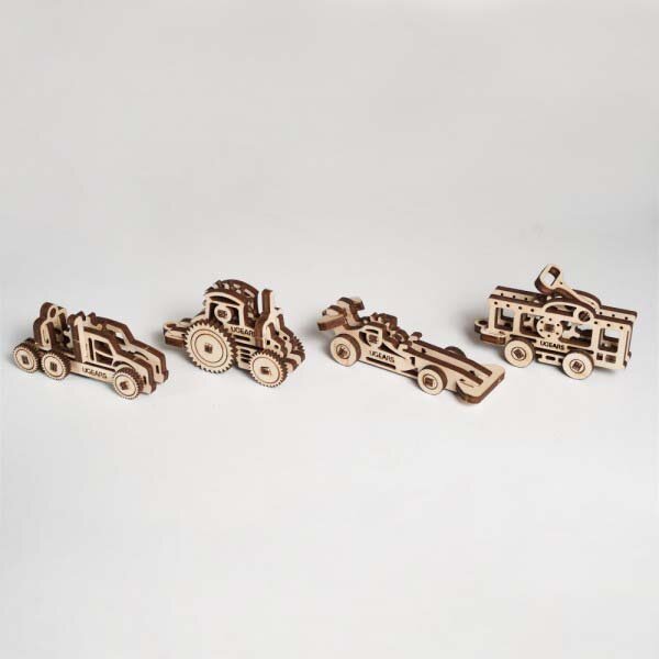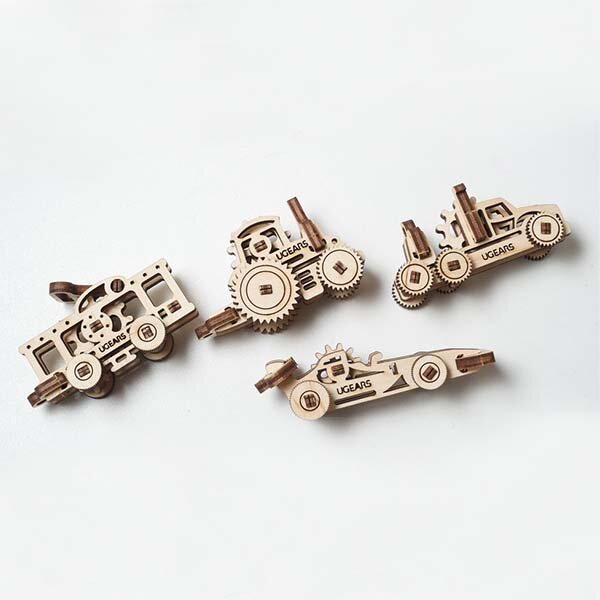 Конструктор Ugears 70033 позволяет собрать четыре миниатюрные фигурки, изображающие разные виды наземного транспорта – спорткар, тягач, трактор и трамвайный вагон. Каждая из них снабжена вращающимися шестернями и креплениями для использования в качестве брелока. Все детали конструктора изготовлены из экологически чистой древесины и украшены рельефными рисунками. Для их сборки не требуются клей, винты и специальные инструменты.