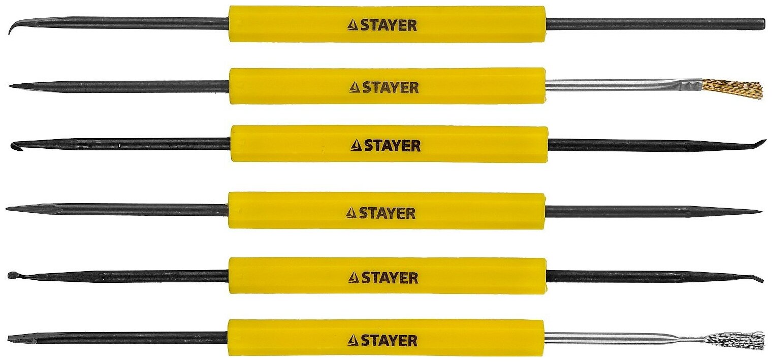 | Прочие особенности и свойства | Паяльное оборудование для пайки STAYER создано на основе современных материалов и технологий. Благодаря соблюдению высоких стандартов качества, инструмент обеспечит надежную работу на протяжении всего срока службы. Является незаменимым помощником, обеспечивая удобство в работе и отличный результат. Набор радиомонтажника Stayer ''MASTER'', 12 в 1(извлекатель диодов, нож, скребок, 2 типа держателя, 2 типа крюков, вилка, 2 типа шипа, 2 типа кисточек) |