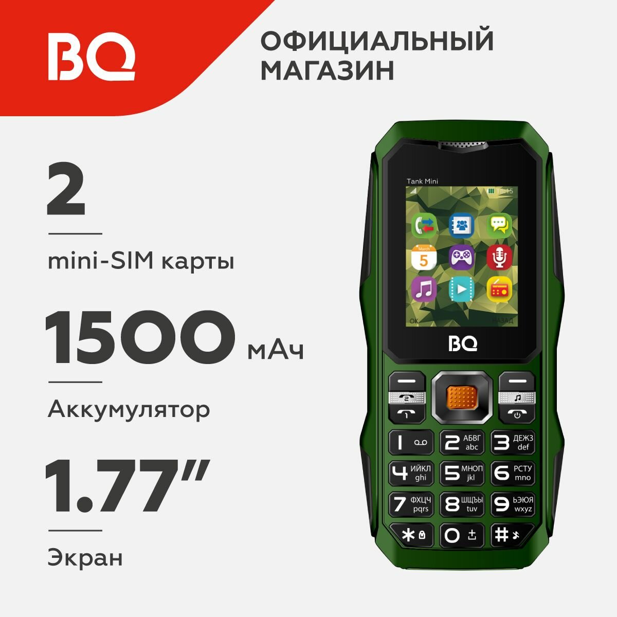 BQ 2428 Tank представляет из себя компактные мобильный телефон, который придется по душе всем любителям практичности и надежности в каждой детали. Аккумулятор устройства способен долго держать заряд, что позволит Вам всегда быть на связи. Удобный корпус телефона позволяет ему максимально комфортно располагаться в руке, а небольшие размеры устройства позволят телефону поместиться даже в самом небольшом кармане. Также стоит отметить стильный дизайн данной модели.