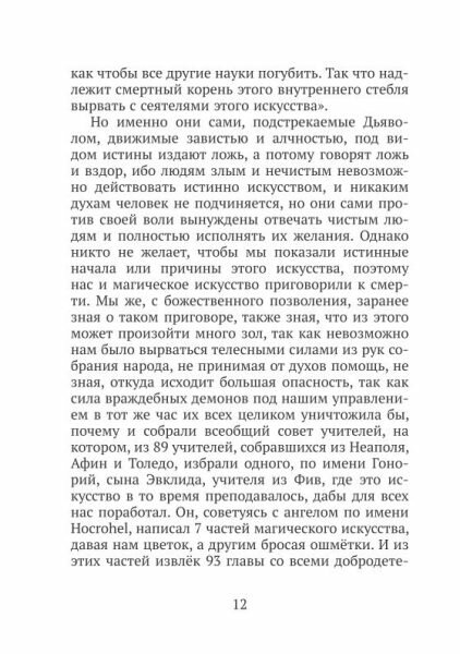 Первый русскоязычный перевод одного из знаменитых гримуаров, повлиявшего в свое время на написания гримуара папы Гонория, на пятую часть Лемегетона, Арс Нотория, на енохианскую магию Джона Ди, а также позволивший историку оккультизма Артуру Эдварду Уэйту предполагать о существовании содружества магов. Особенность этого гримуара состоит в использовании множества различных молитв, ритуал вызова духов также обладает определенной спецификой. Дополняющий книгу трактат о ликантропии позволяет лучше прочувствовать социокультурный контекст. Издана отлично, обложка с золотым тиснением, белая бумага, довольно крупный шрифт.