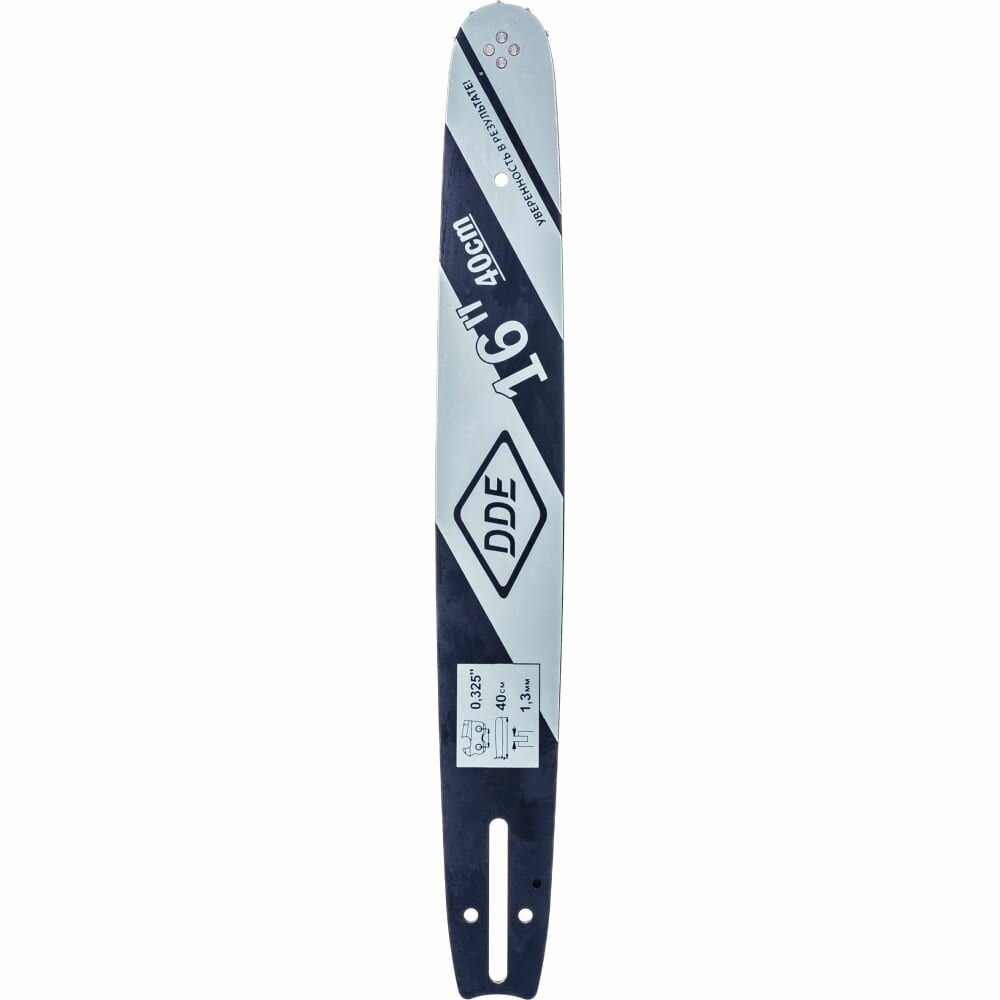 Направляющая шина бензопилы сварная DDE 16''/40см-0.325''PM-1.3-66z (для цепи 20BP/LP,95VPX) (Echo 325'', Homelite 3816,4016, DDE 4116,4618) (160MLBK041). Шина с рабочей длиной 40 см (16 дюймов) для продольного и поперечного пиления. Применяется совместно с пильными цепями 20BP/LP,95VPX/Echo0.325'',Homelite3816,4016,DDE 4116,4618/160MLBK041 с шагом 0.325''PM и толщиной ведущего звена 1,3 мм. Используется на бензопилах профессионального и фермерского класса. Особенности направляющей сварной шины для бензопилы DDE 16''/40см-0.325''PM-1.3-66z (для цепи 20BP/LP,95VPX) (Echo 325'', Homelite 3816,4016, DDE 4116,4618) (160MLBK041). Составляющие пильной гарнитуры оптимально подходят друг к другу, обеспечивая тем самым наилучшую производительность пиления и высокий уровень безопасности в использовании. Износостойкость: направляющие шины DDE изготавливаются из высококачественной хромомолибденовой стали; индукционная закалка опорной поверхности шины, по которой движется пильная цепь, повышает износостойкость; полностью симметричная форма шины DDE позволяет переворачивать её в процессе эксплуатации, этим достигается равномерный износ обеих опорных поверхностей шины. Направляющие шины этого типа оснащаются звездочкой с роликовым подшипником, смазка в подшипник внесена на весь срок службы, но, если шина используется при экстремальных нагрузках, возможно добавить смазку через специальное отверстие. Малый вес: шина для бензопилы DDE 16''/40см-0.325''PM-1.3-66z (для цепи 20BP/LP,95VPX) (Echo 325'', Homelite 3816,4016, DDE 4116,4618) (160MLBK041) состоит из трех пластин соединенных сваркой, средняя пластина представляет собой каркасную конструкцию, это позволило снизить вес на 15% по сравнению с шинами подобных размеров других изготовителей. Технические характеристики направляющей шины для бензопилы 16''/40см-0.325''PM-1.3-66z (для цепи 20BP/LP,95VPX) (Echo 325'', Homelite 3816,4016, DDE 4116,4618) (160MLBK041).