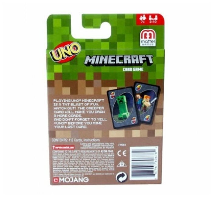 Как и в классической версии UNO™, цель игры UNO™ Minecraft — сбросить все карты, однако теперь в игру входят карты с персонажами и картинками из Minecraft, а также специальное правило! Нужно выкладывать карту, соответствующую верхней карте колоды по цвету или номеру. В конце ты набираешь столько очков, сколько карт осталось у соперников. А еще в UNO™ Minecraft есть новый тип карты действия: вытащив карту с Крипером, обязательно покажите ее другим игрокам — им придется тянуть еще по три карты! Кто первый наберет 500 очков — тот и победитель. Главное — не забыть крикнуть «Уно!», когда сбросишь последнюю карту! От 2 до 10 игроков. Научиться легко, остановиться невозможно.