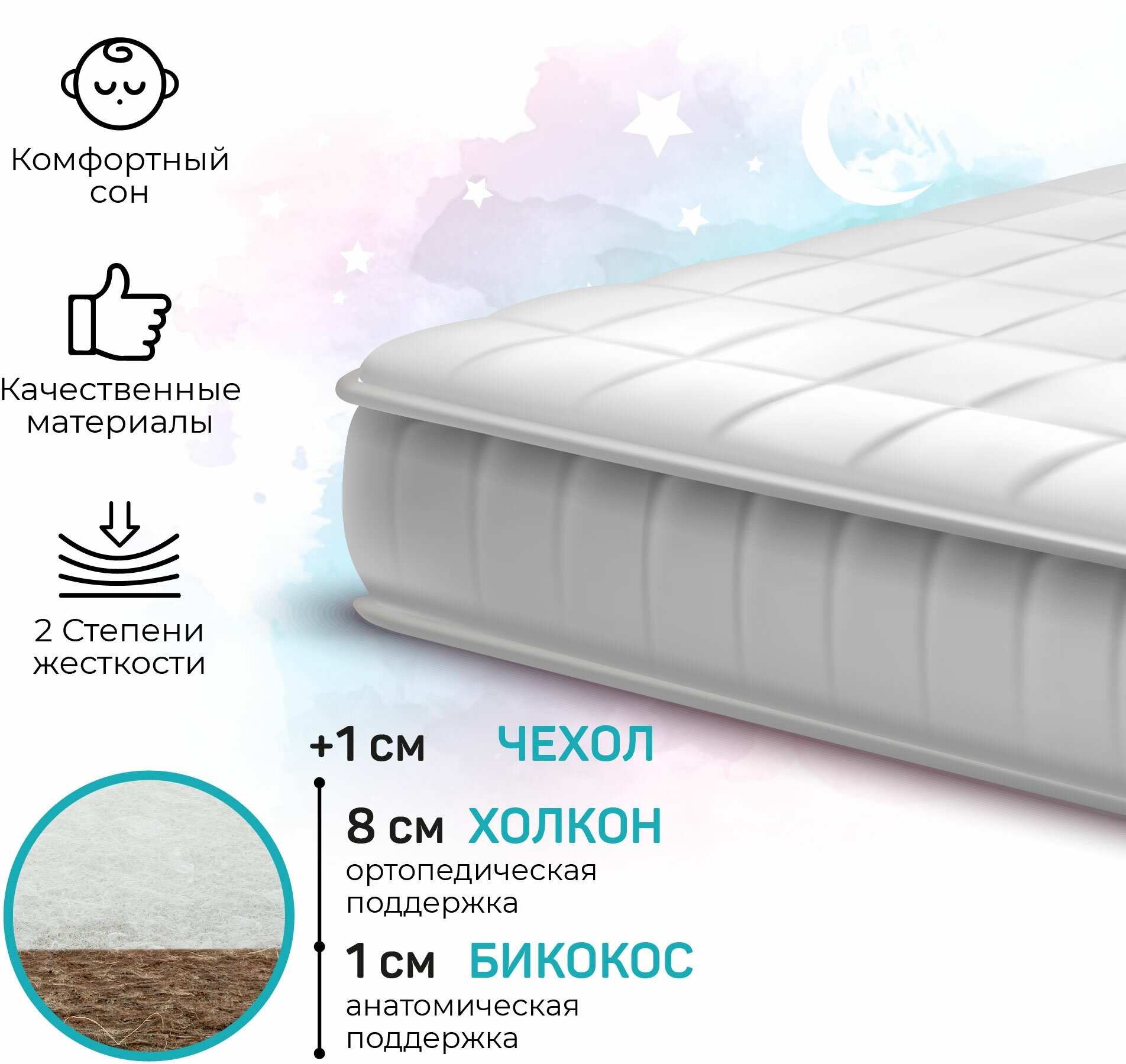 Детские матрасы AmaroBaby – это матрасы повышенной комфортности. Холлкон - не вызывает аллергии, не впитывает влаги и запахов, не накапливает статическое напряжение. За ним легко ухаживать – холлкон можно чистить и стирать при температурах до 75°С. И он прекрасно держит тепло. Кокосовая койра – 100% натуральный материал, один из самых жестких, упругих и эластичных наполнителей, он идеально поддерживает позвоночник маленького ребенка во время сна. 2 стороны матраса обладают разной степенью жесткости, что позволяет адаптировать его под потребности ребенка используя обе его стороны. Высококачественный стеганый мягкий трикотаж (100% хлопок). Хорошо проводит воздух и влагу и быстро высыхает.
