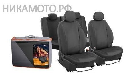 Чехлы изготовлены по бокам и сзади из высококачественной гладкой экокожи, в центральной части используется экокожа триплированная поролоном с перфорацией. На спинках передних сидений расположены вместительные карманы на молнии. Передние чехлы имеют специальный крой не мешающий открытию подушек безопасности.