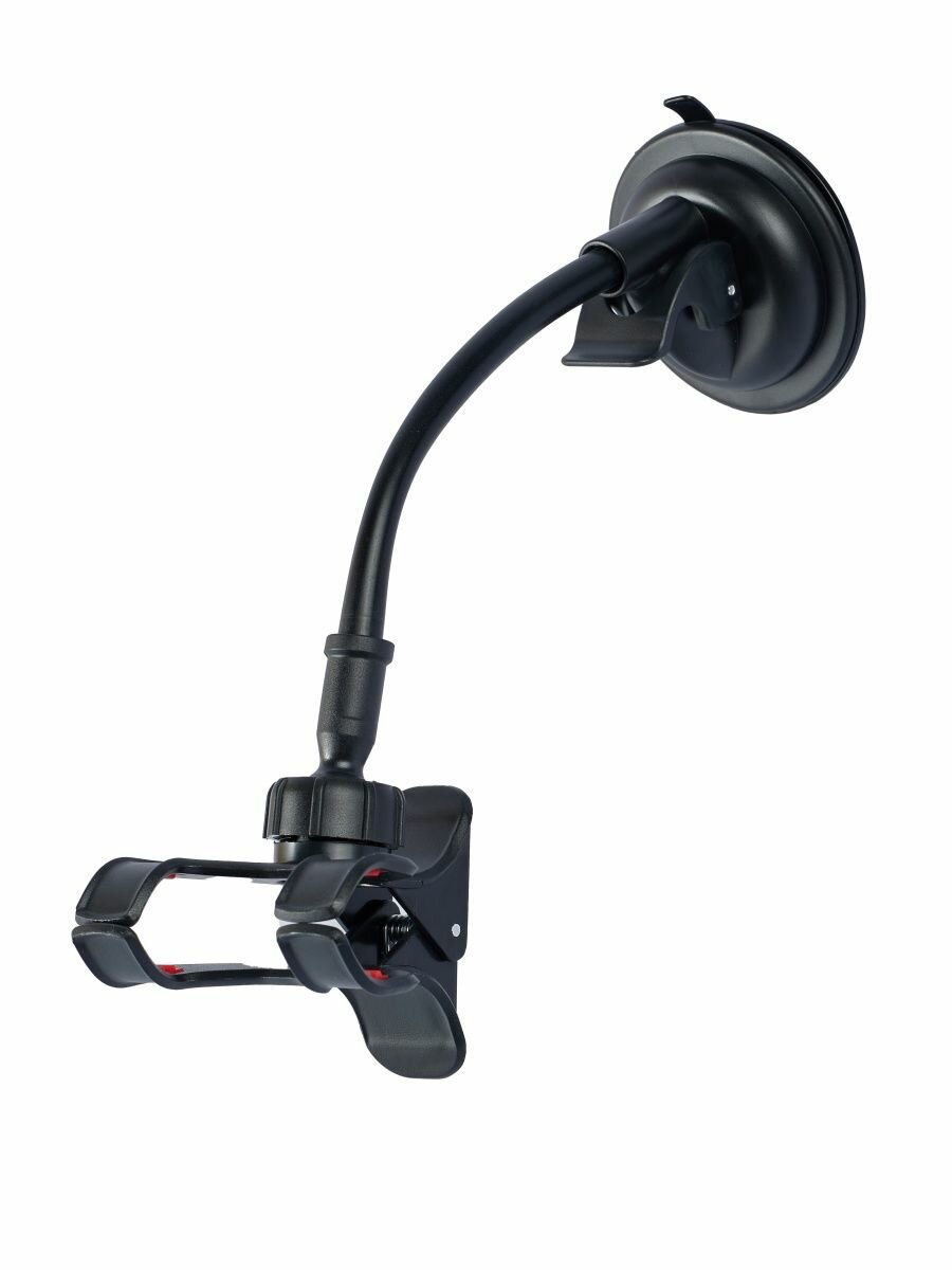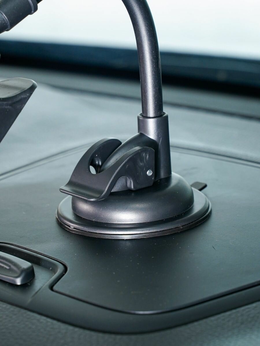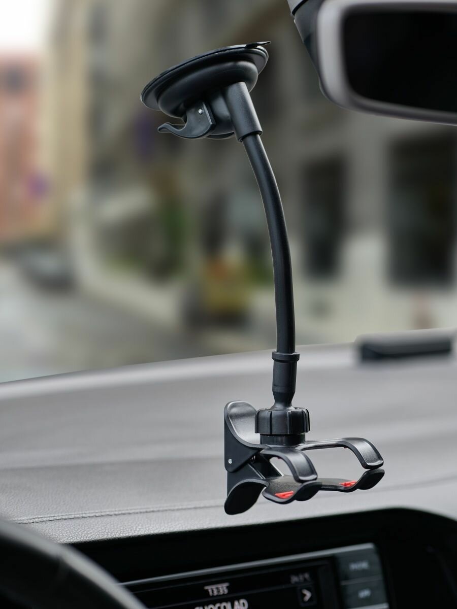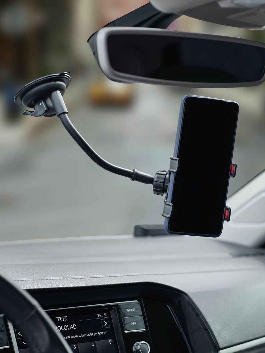 Автомобильный держатель Wiiix позволяет зафиксировать смартфон на лобовом стекле или передней панели, выбрав оптимальный угол обзора. Он снабжен длинной гибкой штангой и поворотным креплением, позволяющим вращать устройство на 360 градусов. Его продуманная конструкция обеспечивает превосходную видимость дисплея в любой ситуации. Держатель совместим с мобильными девайсами шириной до 10,5 сантиметра – в том числе последними моделями Samsung Galaxy, iPhone, Huawei Honor, Xiaomi.