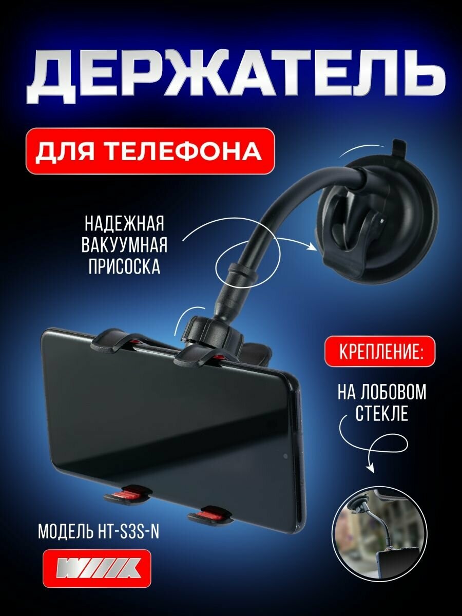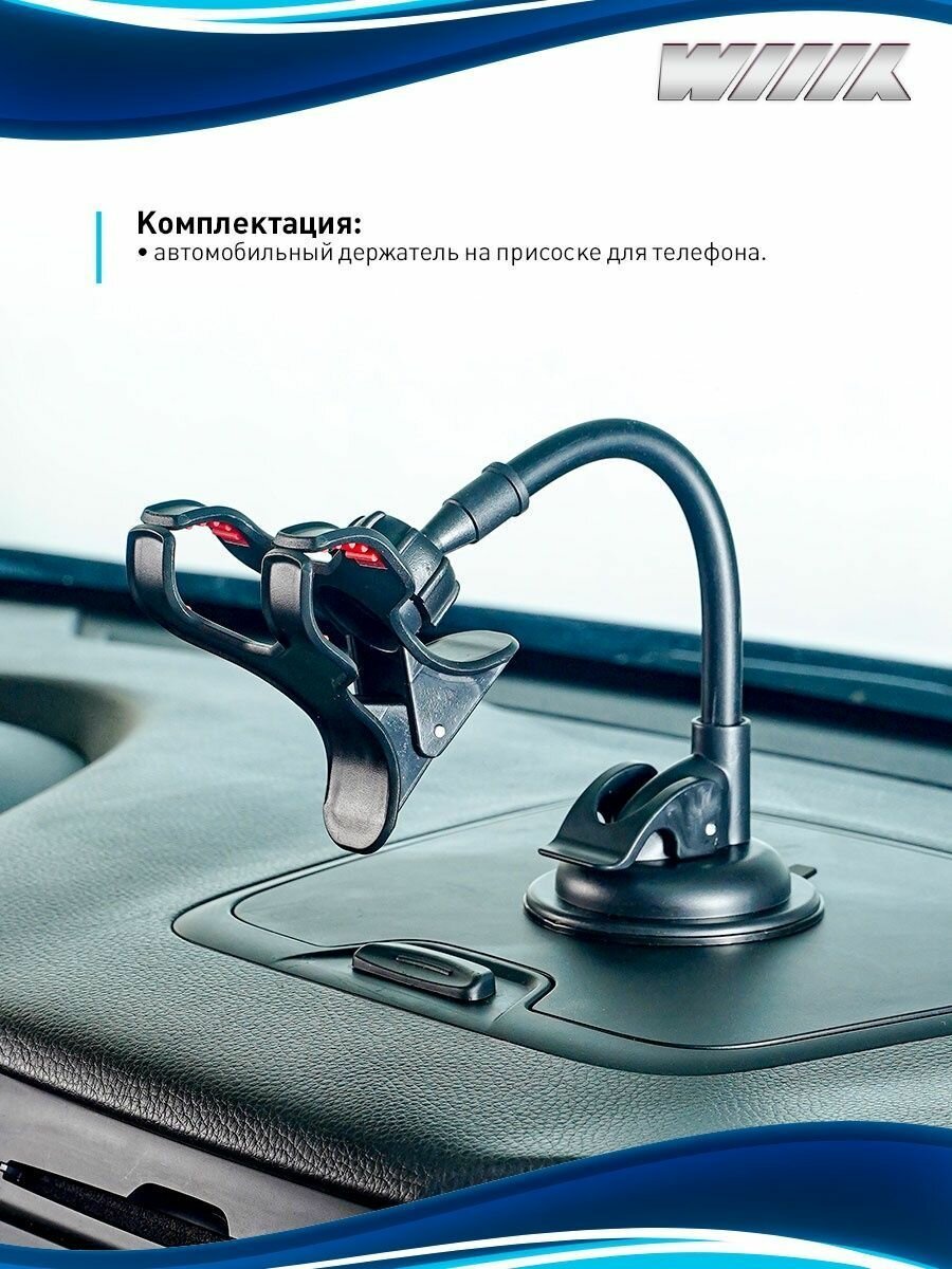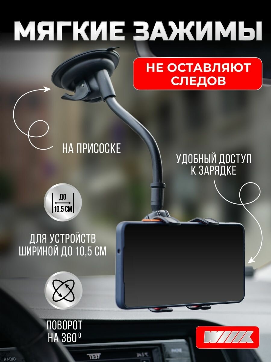 WIIIX - держатель смартфона в автомобиль. - Простой и надежный механизм зажима смартфона. - Длинная штанга позволяет разместить смартфон в зоне удобного доступа. - Силиконовая присоска обеспечивает надежную фиксацию держателя на панели приборов автомобиля или лобовом стекле. - Держатель позволяет регулировать наклон и поворот смартфона, чтобы сделать его использование более удобным и исключить засветку и блики на экране. Для смартфонов шириной до 10,5 см.