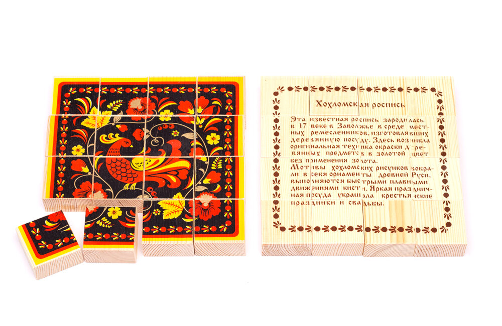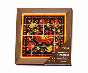 Пазлы Русские узоры состоят из 16 деталей, которые складываются в яркую картинку. В разных народных промыслах птицы изображались по-своему. Приобщайте своего ребенка к народным промыслам, а вместе с этим развивайте его логику и внимание, художественное восприятие и эстетический вкус. Уже маленькому ребенку можно предлагать первые простые задания с пазлом. Попросите ребенка внимательно рассмотреть картинки, они останавливаются, думают и вспоминают, как собрать конкретный пазл. Уберите несколько деталей и попросите малыша вставить их на нужные места. Постепенно увеличивайте число вынимаемых кубиков. Задача крохи — правильно разместить красочные плашки на деревянном основании, чтобы получилась цельная картинка. Необычная головоломка сочетает в себе пазл и красочную картину. Аккуратно переверните собранный рисунок. На оборотной стороне кубиков написана история промысла. Прочитайте ее ребенку, найдите другие примеры росписи в быту, на сувенирах, в иллюстрациях книг. Чем более ярким и интересным будет изучение нового для малыша – тем больше он запомнит и тем сильнее будет хотеть учиться еще и еще. Идеальный вариант для развития малыша с первых лет жизни – деревянный пазл, созданный по системе Монтессори от фабрики Томик. Для детей детские пазлы эта увлекательная настольная игра будет еще и полезна, развивается мелкая моторика, дети учатся внимательности, логике, терпению, усердию и аккуратности. А по окончанию сборки пазлы из дерева у вас получится замечательная картина, прекрасные деревянные пазлы игрушки, чтобы украсить детскую комнату. Превосходный беспроигрышный подарок пазл деревянный для детей и пазл для девочек , пазл для детей и всей семьи. Малышу будет приятно изучать окружающий мир, соприкасаясь с деталями из натурального дерева. Такие наборы повышают сосредоточенность, память и внимание ребенка, пазлы стимулируют координацию рук, развивают мелкую моторику.