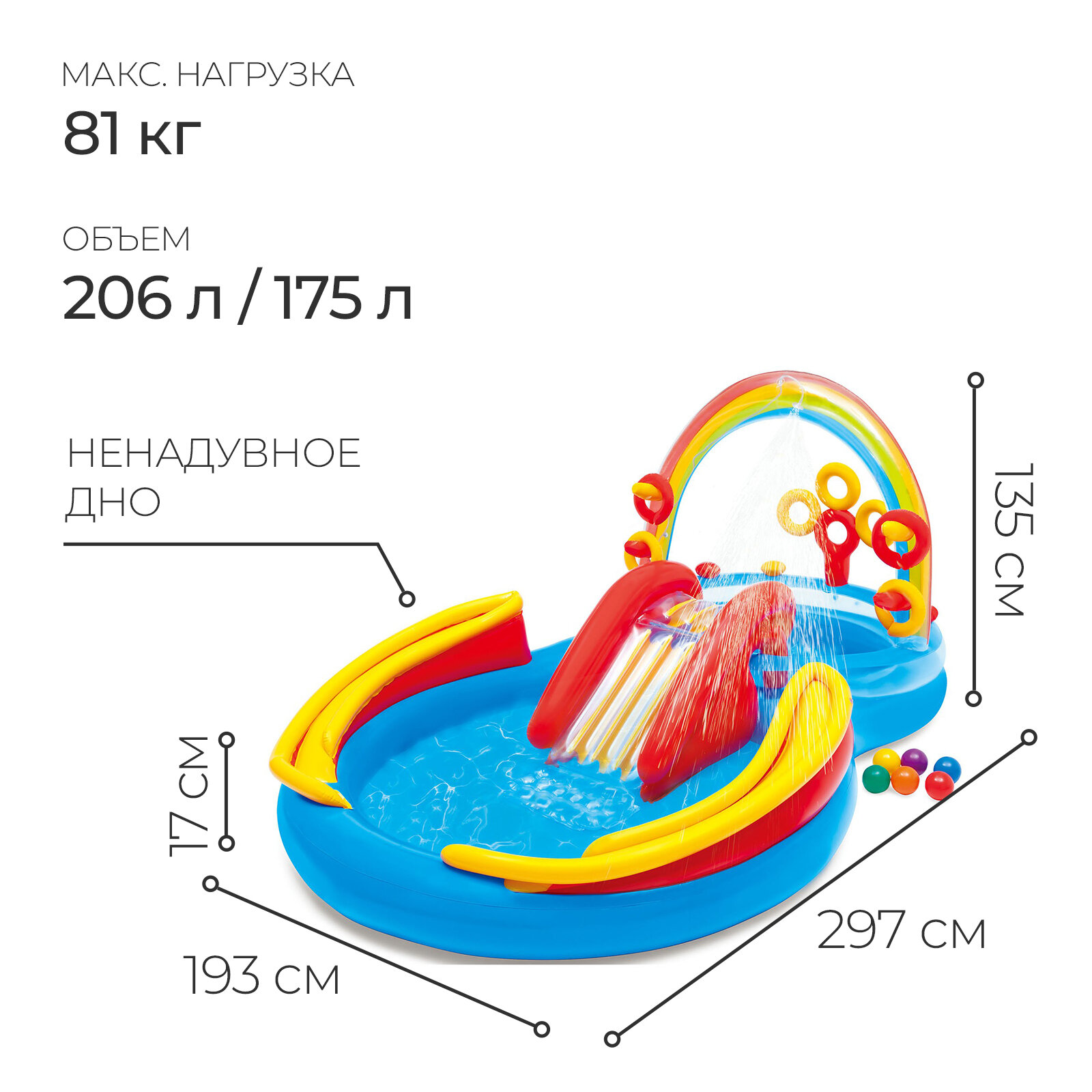 | Комплектация | мяч; ремкомплект; сливной клапан; горка; надувная игрушка |