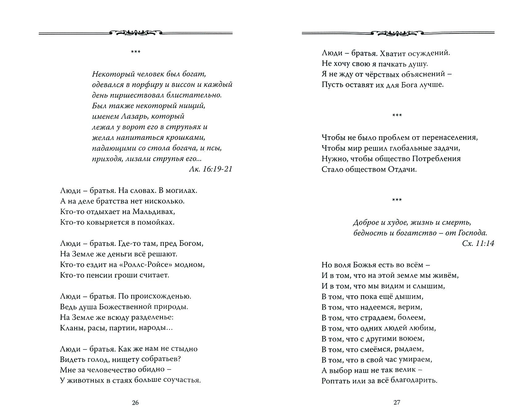 Исповедальные строки о невозможности земного счастья, крахе всех мирских целей и надежд, принятии своей судьбы, как воли Бога, переосмысление духовного опыта православия, цикл стихов, обращенных к Божией Матери, аллюзии на библейские мотивы, помогут читателю справиться с душевными ранами, обрести покой и научиться прощению, терпению и независящей ни от чего любви.
