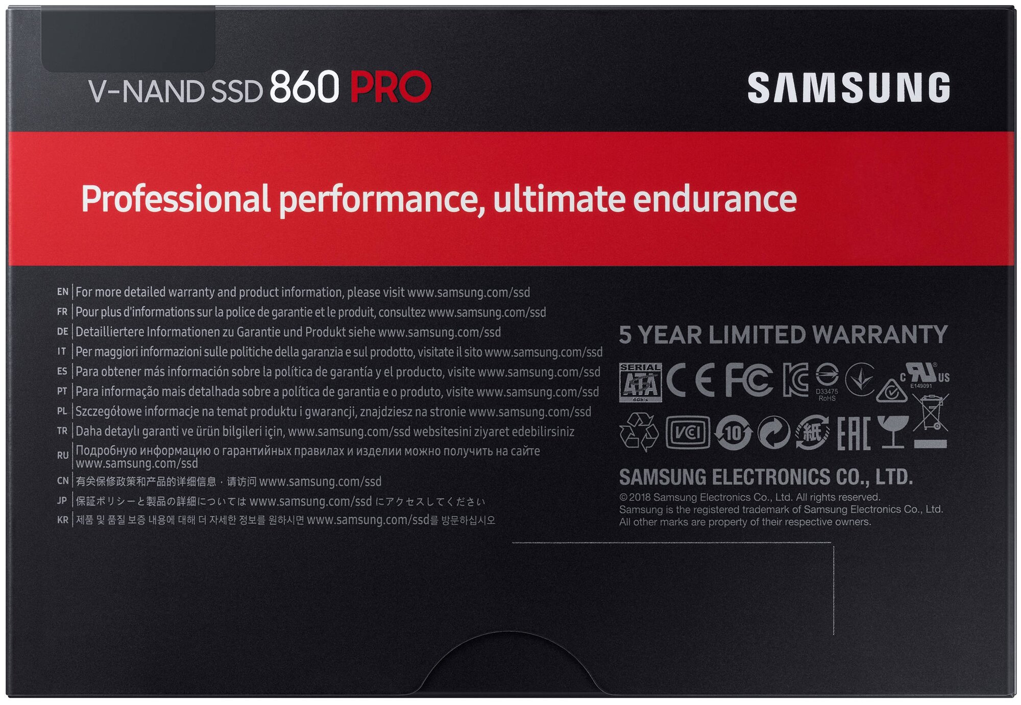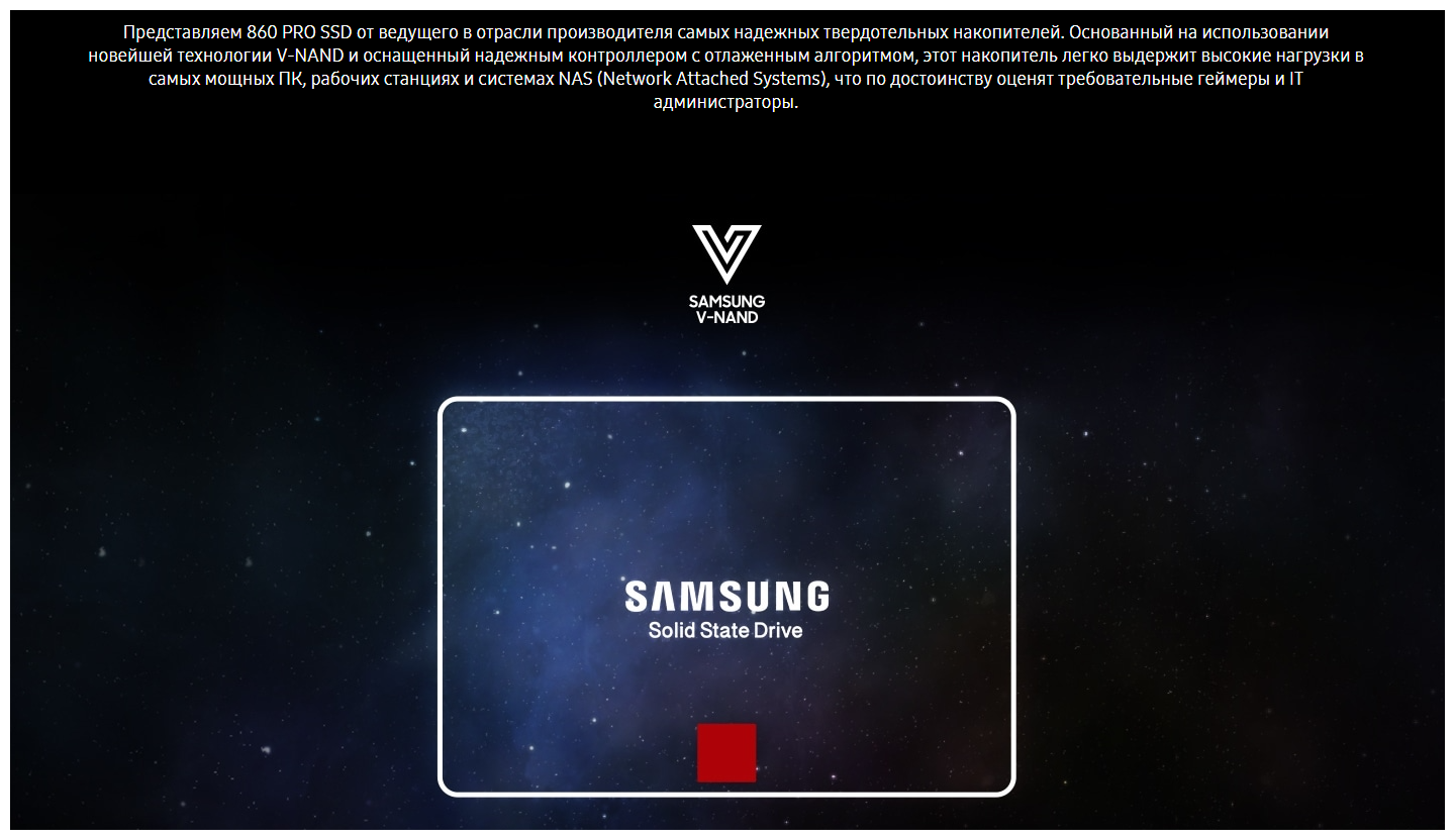 Представляем 860 PRO SSD от ведущего в отрасли производителя самых надежных твердотельных накопителей. Основанный на использовании новейшей технологии V-NAND и оснащенный надежным контроллером с отлаженным алгоритмом, этот накопитель легко выдержит высокие нагрузки в самых мощных ПК, рабочих станциях и системах NAS (Network Attached Systems), что по достоинству оценят требовательные геймеры и IT администраторы.Улучшенные рабочие характеристики. Скорости чтения и записи отличаются удивительной стабильностью даже при самых высоких нагрузках и при использовании многозадачного режима. Скорость последовательной записи накопителя 860 PRO достигает 530 Мб/с, а благодаря оптимальному сочетанию новейшей технологии V-NAND с эффективным контроллером скорость последовательного чтения достигает 560 Мб/с. Исключительная надежность. При высоких рабочих нагрузках надежность - это самая важная характеристика накопителя. Храните и обрабатывайте 4K видео и 3D данные с помощью новейших программ и не беспокойтесь о сохранности данных. Ресурс накопителя по записи (TBW) в 8 раз превышает аналогичную характеристику накопителя 850 PRO. Новейшая технология V-NAND обеспечивает максимальный в отрасли гарантийный срок (5 лет) или 4800 терабайт по записи. Smart совместимость. Оцените преимущества увеличения скорости коммуникации SSD с вашей хост системой. Отлаженный ECC алгоритм и новый MJX контроллер обладают более высокой скоростью работы, а более эффективно работающая команда queued trim обеспечивает улучшенную совместимость с ОС Linux. Усовершенствованные технологии Samsung обеспечивают улучшенную совместимость накопителя 860 PRO с вашей компьютерной системой.