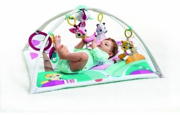 Развивающий коврик Принцесса в нежных розовых тонах для маленьких принцесс. В комплекте 4 подвесные игрушки и безопасное зеркальце, которые можно использовать отдельно. Нежные не броские оттенки, возможность регулировать наклон дуг и переставлять игрушки делают этот коврик универсальной площадкой для игр. Игрушка в виде птички производит музыку и может светиться. На самом коврике также встроенные развивающие элементы в виде разных фактур, ленточек, шуршащих элементов и открывашек.