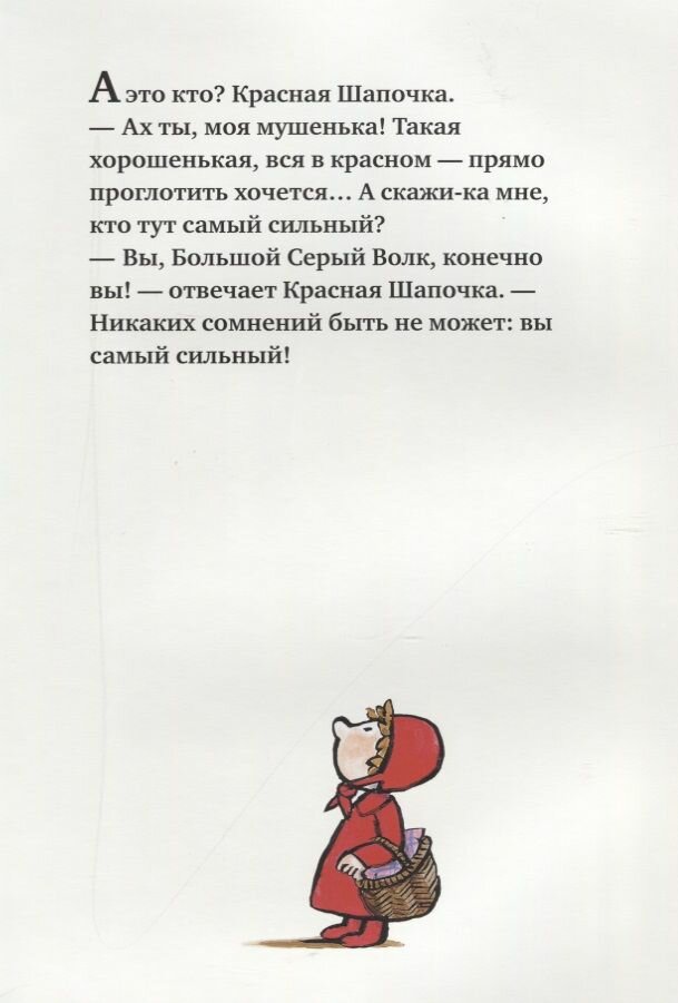 После обеда волк идет прогуляться по лесу, чтобы убедиться: он самый сильный, самый матерый, самый страшный! Зайчик, Красная Шапочка, три поросенка, семь гномов - все как один спешат с ним согласиться. Кто же осмелится ему возразить?