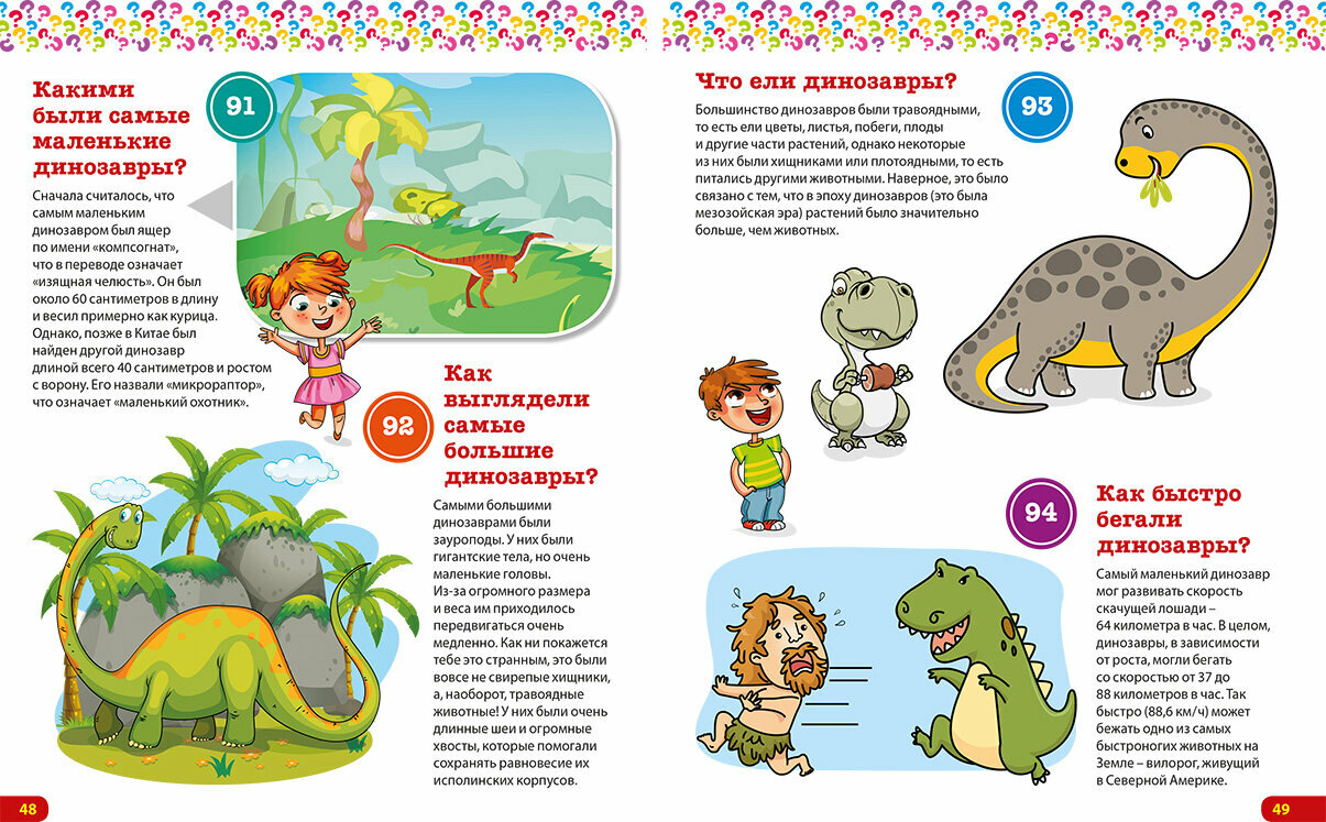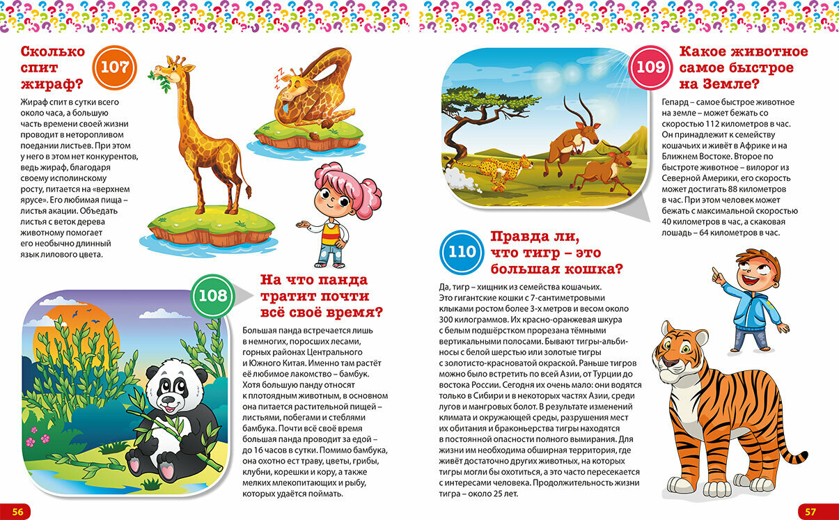 Отмечу сразу, что в энциклопедии нет как такового четкого содержания, нет четких глав. Описание тем представлено в виде ответов на вопросы. При этом это не просто банальные вопросы, а вопросы такого формата, как обычно задают дети. К примеру: самое быстрое животное или почему мы видим сны? Поэтому, как мне кажется, и читается эта энциклопедия намного интереснее других, т.к. вроде бы серьезные темы тут раскрыты под совершенно другим углом.
