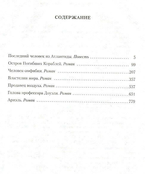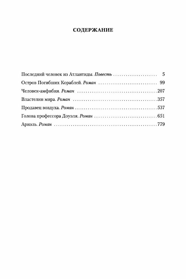 В книгу включены лучшие, давно вошедшие в золотой фонд советской научной фантастики произведения Александра Беляева: повесть «Последний человек из Атлантиды» (1925) и романы «Человек-амфибия» (1928), «Властелин мира» (1926–1929), «Голова профессора Доуэля» (1937), «Человек, нашедший свое лицо» (1940) и «Ариэль» (1941). Увлекательные путешествия и удивительные превращения, блистательные, дерзновенные и вместе с тем преступные научные эксперименты, драматически изменяющие судьбы главных героев и подчас грозящие гибелью всему миру, любовь, успешно противостоящая лжи и корысти, но вынужденная отступить перед благородной самоотверженностью, – таковы сквозные мотивы и сюжетные коллизии беляевской прозы, и по сей день не утратившей своего романтического обаяния.