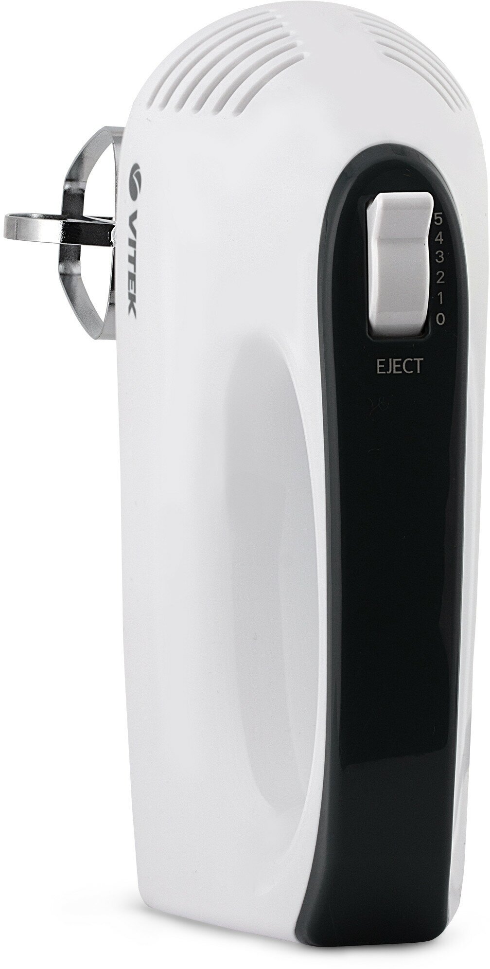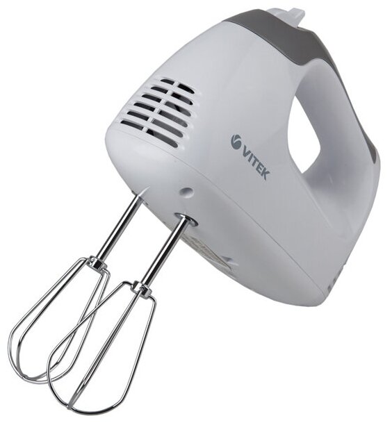 Мощность миксера Vitek VT-1410 W составляет 300 ватт, что позволяет легко и быстро выполнить любую работу, которая обычно может занимать довольно много времени. Две стандартные насадки, венчики для взбивания и крюки для теста, надежно фиксируются при работе и могут быть отсоединены лишь при нажатии специальной кнопки. Благодаря тому, что миксер может работать в пяти скоростных режимах, вы сможете очень аккуратно взбить яйца, размешать любые жидкости или замесить тесто.