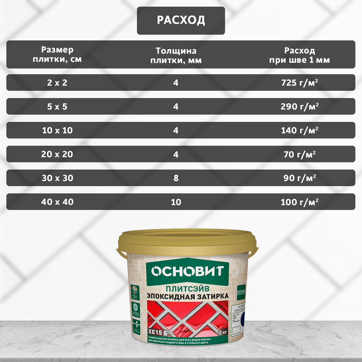 Эпоксидная затирка ОСНОВИТ ПЛИТСЭЙВ ХE15 Е предназначена для заполнения и защиты межплиточных швов шириной до 15 мм на полах и стенах в жилых, общественных и производственных помещениях, медицинских учреждениях и помещениях с высокой проходимостью.