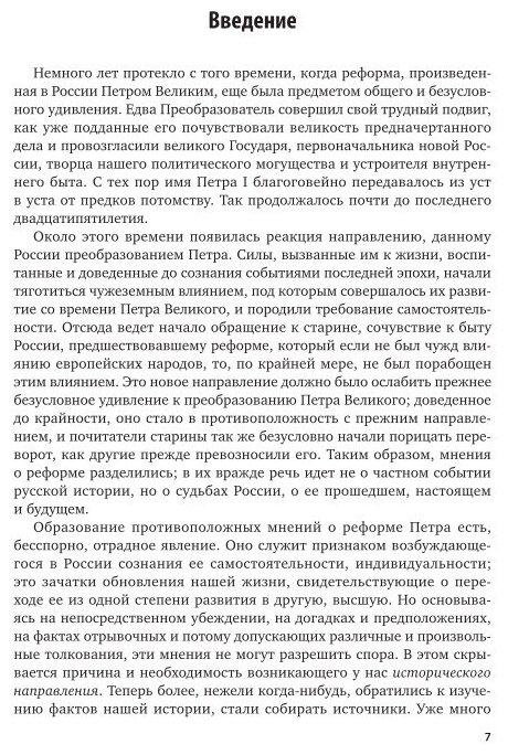 Несколько лет протекло с того времени, когда реформа, произведенная в России Петром Великим, еще была предметом общего и безусловного удивления, однако и по сей день она вызывает противоречивую реакцию. Мнения о реформе разделились; и в их вражде речь идет не о частном событии русской истории, но о судьбах России, о ее прошедшем, настоящем и будущем.