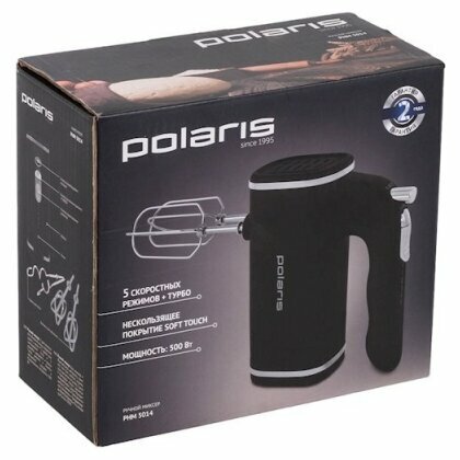 | Прочие особенности и свойства | Миксер Polaris PHM 5014 поставляется в комплекте с венчиками для взбивания кремов и яиц, а также со специальными приспособлениями для замешивания густого теста. Прибор подходит для выполнения любых работ – в нём предусмотрено пять скоростей вращения мотора, а также турбо-режим, кратковременно повышающий мощность. Пользователю не нужно пачкать руки, извлекая насадки. Достаточно нажать на кнопку и они сами выскользнут в раковину или в подставленную миску. Пластиковое покрытие корпуса Soft-Touch позволяет надёжно удерживать миксер в руках даже при его интенсивном использовании. Металлическая площадка обеспечивает экономию места в кухне за счёт хранения прибора в вертикальном положении. |