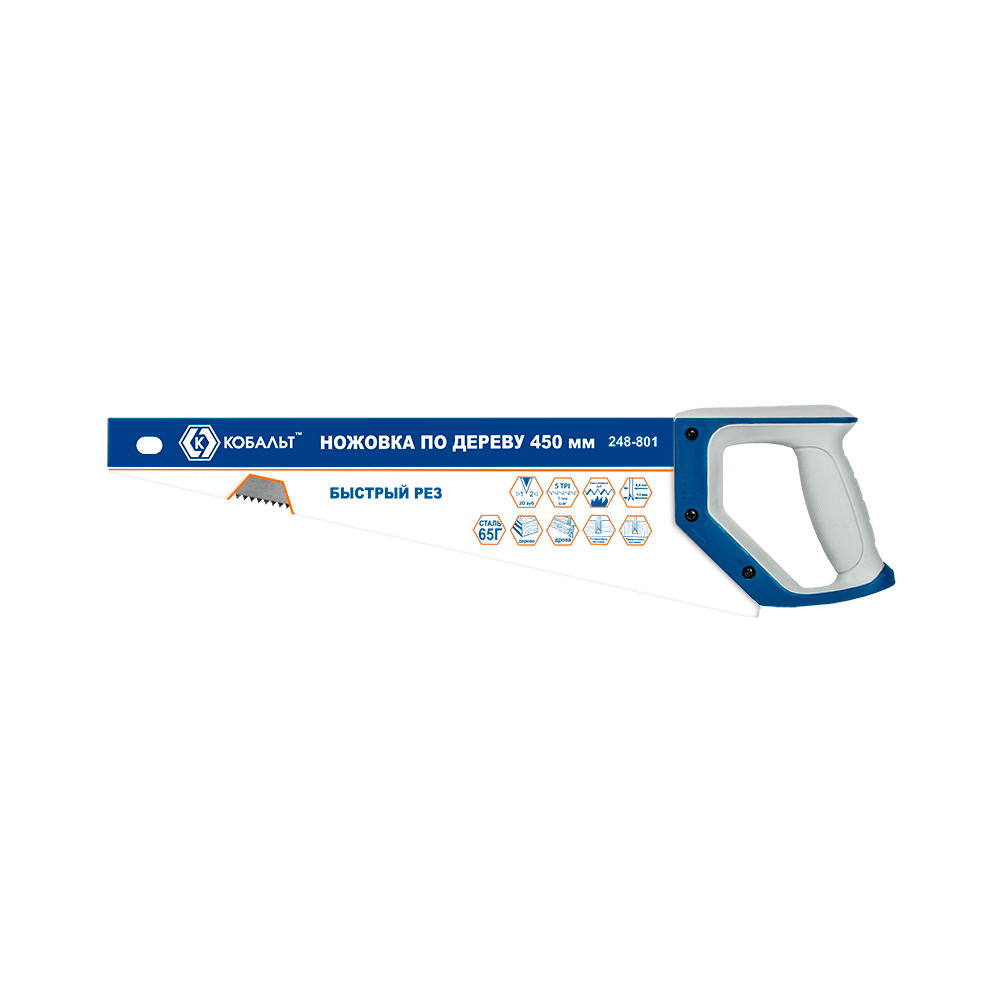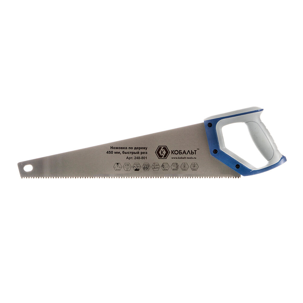 Ножовка по дереву кобальт 450 мм, шаг 5 мм/ 5 TPI, закаленный зуб предназначена для быстрого, прямолинейного пиления мягкой и твердой древесины. Идеально подходит для заготовки дров. Изготовлена из углеродистой инструментальной стали 65Г.Эргономичная D-образная двухкомпонентная рукоятка идеально сидит в руке, не оставляет мозолей, снижает усталость и способствует повышению производительности работы. Поверхностная закалка режущей кромки зуба способствует сохранению заточки длительное время. Длина общая/рабочая 540/450 мм, шаг зубов 5,0 мм (5 TPI).* Компания-производитель оставляет за собой право на изменение комплектации и места производства товара без уведомления дилеров!* Указанная информация не является публичной офертой.