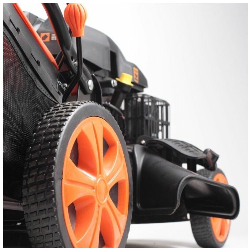 Мощная бензиновая газонокосилка. Скорость оборотов - 3000 об/мин. Ручка складная с регулируемой высотой. Возможна работа в трех режимах: сбор травы в травосборник, боковой выброс травы, режим мульчирования. Возможность запуска от Li-Ion аккумулятора.