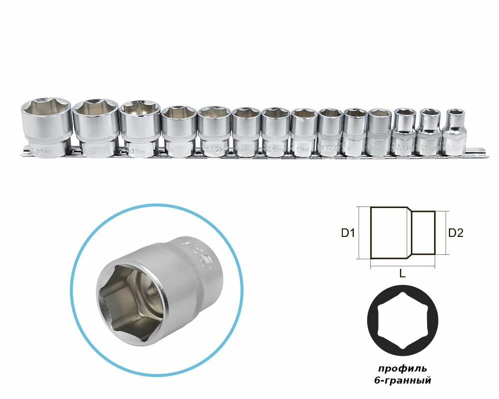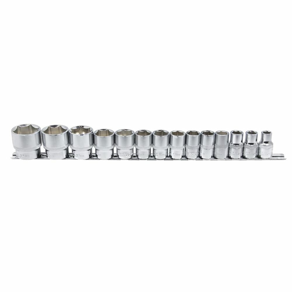 Набор сменных торцевых головок 1/2" дюйма 6-гранных 10-32 мм 14 предметов на металлической планке используется для взаимодействия с резьбовыми соединениями шестигранного профиля. Набор шестигранных головок 1/2" включает ряд головок размером от 10 мм до 32 мм. Для использования набора больших сменных головок 1/2" потребуется наличие воротка или трещотки с присоединительным квадратом 1/2" дюйма. Набор головок под большую трещетку или вороток.Материалы и технологический процесс изготовления:- сталь: хромованадиевая Cr-V 50BV30;- обработка: полирование, закалка ТВЧ;- покрытие: трехслойное хромоникелевое сатиновое;- твердость: 42-46 HRC.Конфигурация:- 6-гр. динамический профиль;- посадочный квадрат 1/2" (12.7мм) с динамическим профилем;- накатка по окружности.Комплектация:1/2" Головка 6-гр: 10, 12, 13, 14, 15, 16, 17, 18, 19, 22, 24, 27, 30, 32 мм - 14 шт.Прочее:- на металлической планке держателе (рельсе).