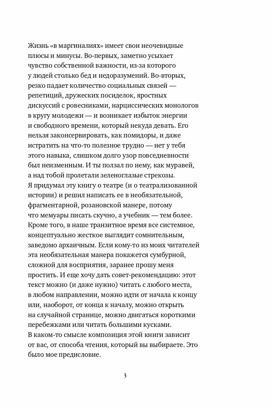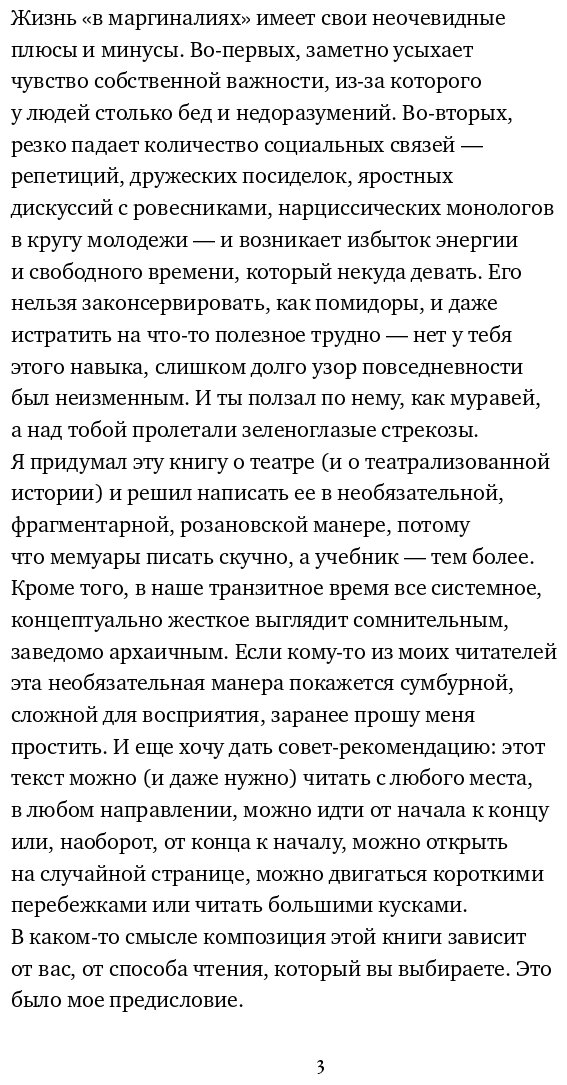 Жизнь в театре и театр в жизни и в политике, отношение государства к искусству, миф и мифология в культуре и повседневности, противостояние архаичного прошлого и современности - вот главные темы, которые затрагивает в своей книге режиссер театра и кино Владимир Мирзоев. Написанная в формате дневника, она представляет размышления автора о том, что волнует и его самого, и всех тех, кого он называет "русскими европейцами". Читать книгу можно с любого места и в любом направлении - от начала к концу или наоборот. Как отмечает сам Владимир Мирзоев, в каком-то смысле ее композиция зависит от вас, от того способа знакомства с ней, который вы выберете. В приложении мастер дает профессиональные советы актерам. Таким образом, для широкой аудитории эта книга станет вдохновляющим чтением и поводом для раздумий, а для тех, чья жизнь связана с театром и кино, - еще и полезным практическим руководством. Эта книга вся составлена из отдельных фрагментов - мыслей, эпизодов, отступлений. Советую играть с ней в "русскую рулетку": читать не подряд, как один текст, а открывать наугад, в любом месте. Рано или поздно выстрелит и попадет прямо в сердце, можете не сомневаться.
