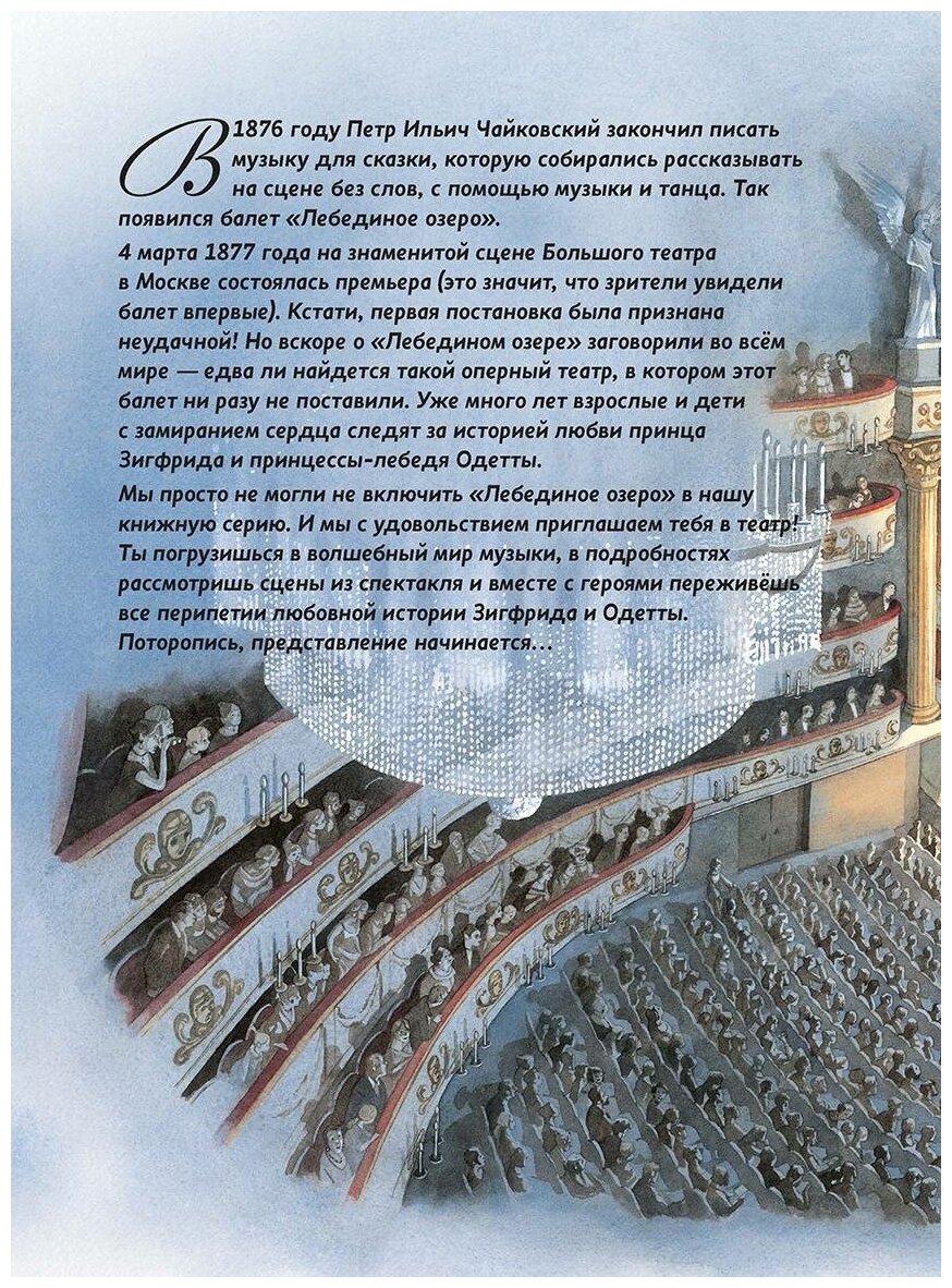Чарующие звуки музыки и сказочный мир на страницах детских книг! Представляем коллекцию, которая не оставит равнодушным ни одного взрослого или юного читателя! В книгах этой серии вас ждет уникальное сочетание: либретто известнейших шедевров мировой музыкальной классики, адаптированные для детей дошкольного и младшего школьного возраста, дополненные диском с мелодиями из самих произведений и интересными комментариями.Текст читает Анастасия Меньшикова. Аудиотрек подготовлен при участии коллективаМосковского драматического театра им. М.Н. Ермоловой."Лебединое озеро" - всемирно известный балет великого русского композитора Петра Ильича Чайковского, рассказывающий удивительную сказку о влюбленном принце, заколдованной девушке и злом волшебнике.