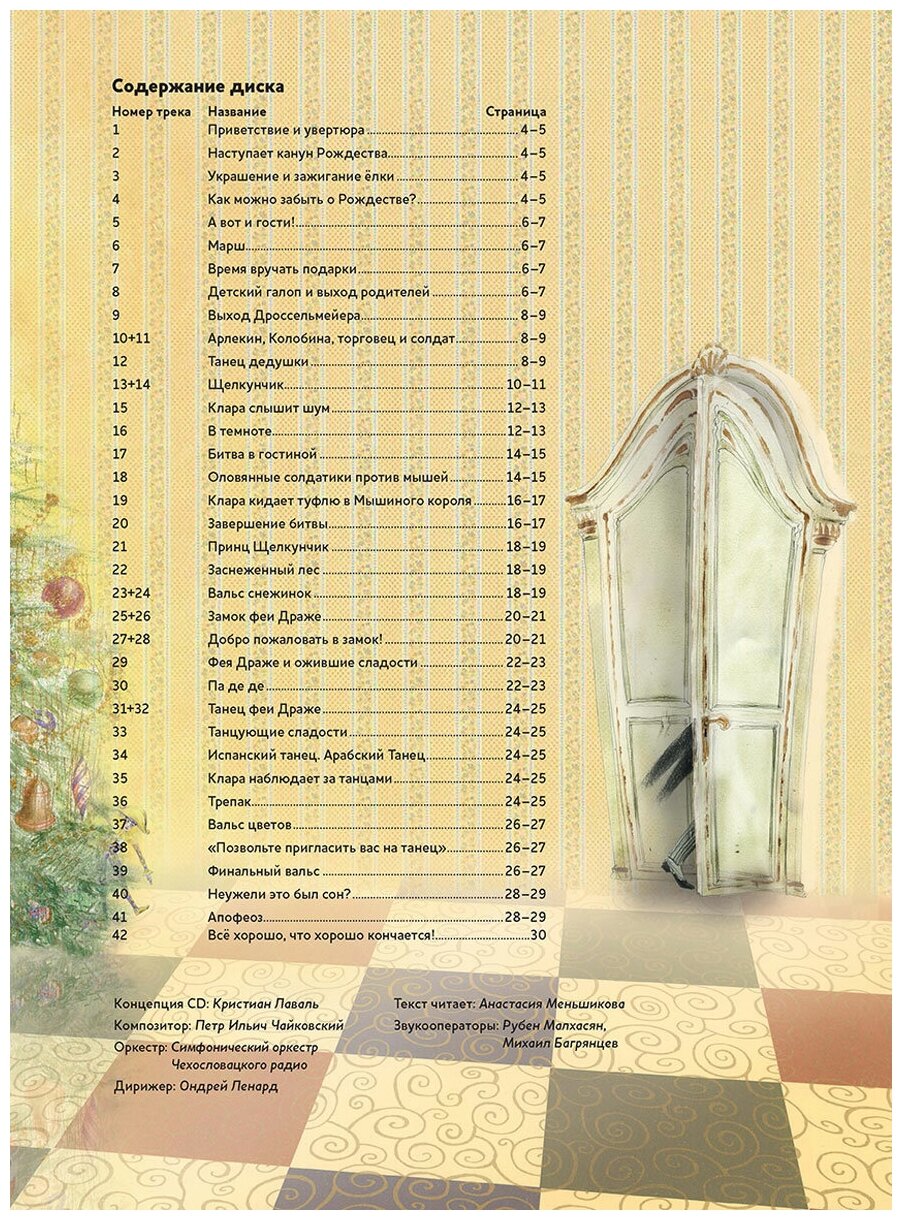 Чарующие звуки музыки и сказочный мир на страницах детских книг! Представляем коллекцию, которая не оставит равнодушным ни одного взрослого или юного читателя! В книгах этой серии вас ждет уникальное сочетание: либретто известнейших шедевров мировой музыкальной классики, адаптированные для детей дошкольного и младшего школьного возраста, дополненные диском с мелодиями из самих произведений и интересными комментариями. Текст читает Анастасия Меньшикова. Аудиотрек подготовлен при участии коллектива Московского драматического театра им. М.Н. Ермоловой."Щелкунчик" - балет великого русского композитора Петра Ильича Чайковского на сказку Эрнста Гофмана, волшебная рождественская история о девочке с добрым сердцем, спасшей от злых чар и мышиного войска Принца, обращенного в деревянную игрушку
