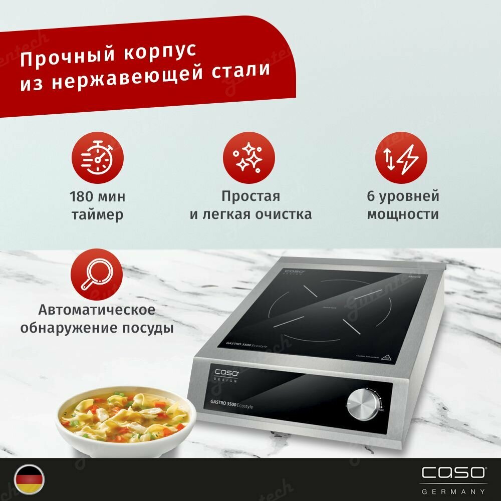 Нет возможности установить полноразмерную варочную поверхность? Это не повод отказывать себе в горячих блюдах! Настольная индукционная плитка Caso Gastro 3500 Ecostyle поместится куда угодно: в очень маленькую кухню, съёмную комнату, дачный домик.
