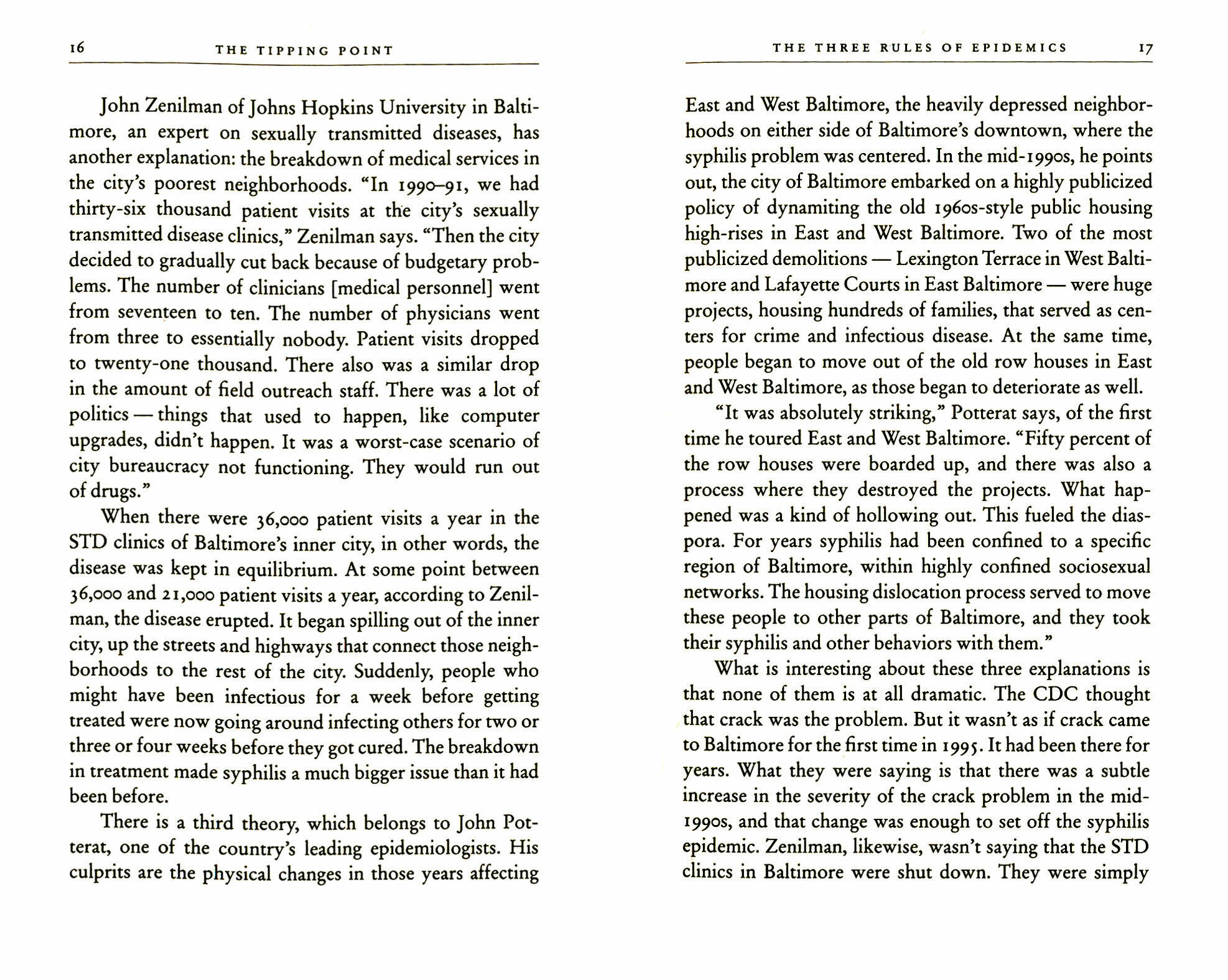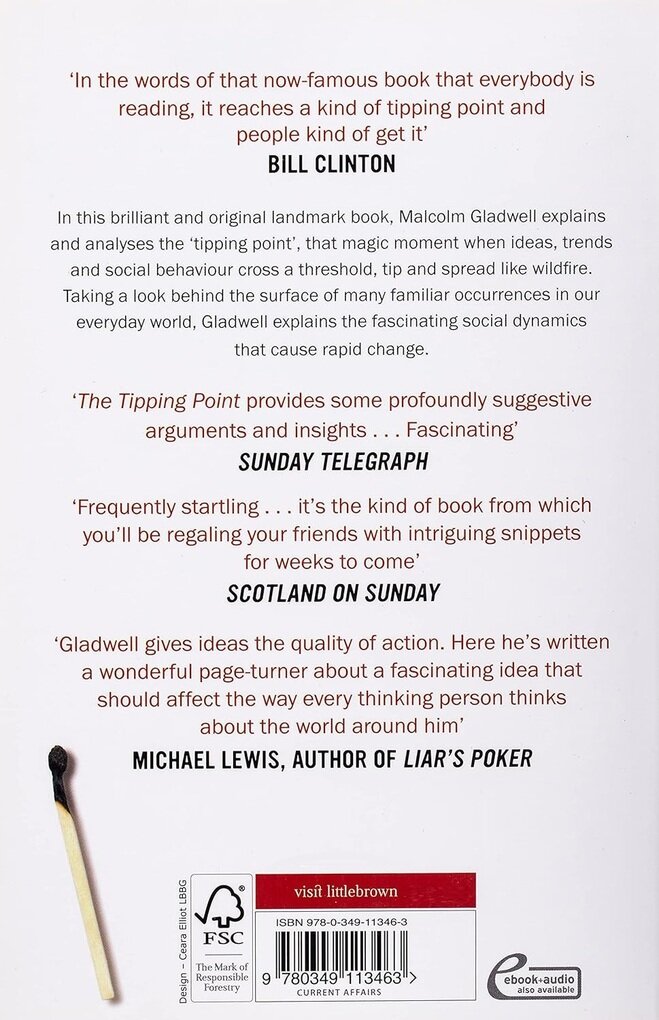 The tipping point is that magic moment when an idea, trend, or social behavior crosses a threshold, tips, and spreads like wildfire. Just as a single sick person can start an epidemic of the flu, so too can a small but precisely targeted push cause a fashion trend, the popularity of a new product, or a drop in the crime rate. This widely acclaimed bestseller, in which Malcolm Gladwell explores and brilliantly illuminates the tipping point phenomenon, is already changing the way people throughout the world think about selling products and disseminating ideas.