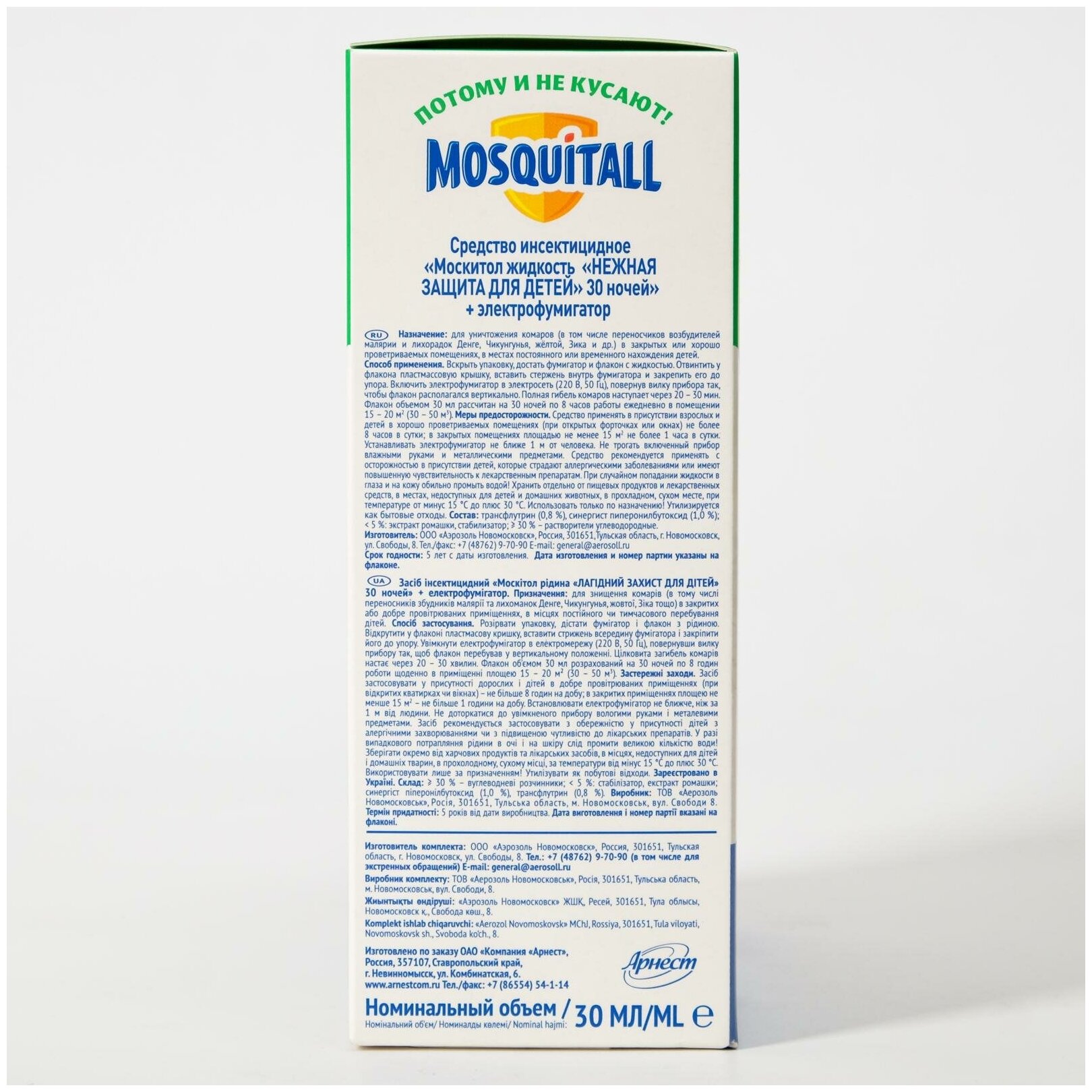 Комплект Нежная защита от Mosquitall создан специально для защиты и уничтожения кровососущих насекомых в помещении. Набор включает в себя универсальный электрофумигатор и флакон с жидкостью от комаров. Он максимально безопасен и разрешен к применению в присутствии детей. Жидкость надежно и бережно защитит спокойный сон и отдых ребенка на протяжении 30 ночей. Поворотная вилка позволяет устанавливать фумигатор даже в неудобно расположенные розетки, возможно использование пластин от комаров.
