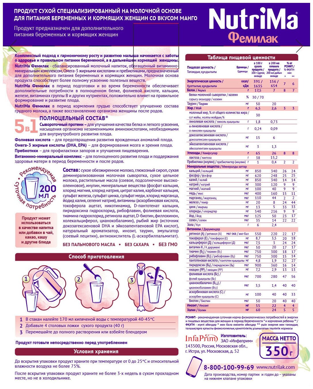 - Напиток молочный Nutrima Фемилак для беременных женщин и кормящих матерей