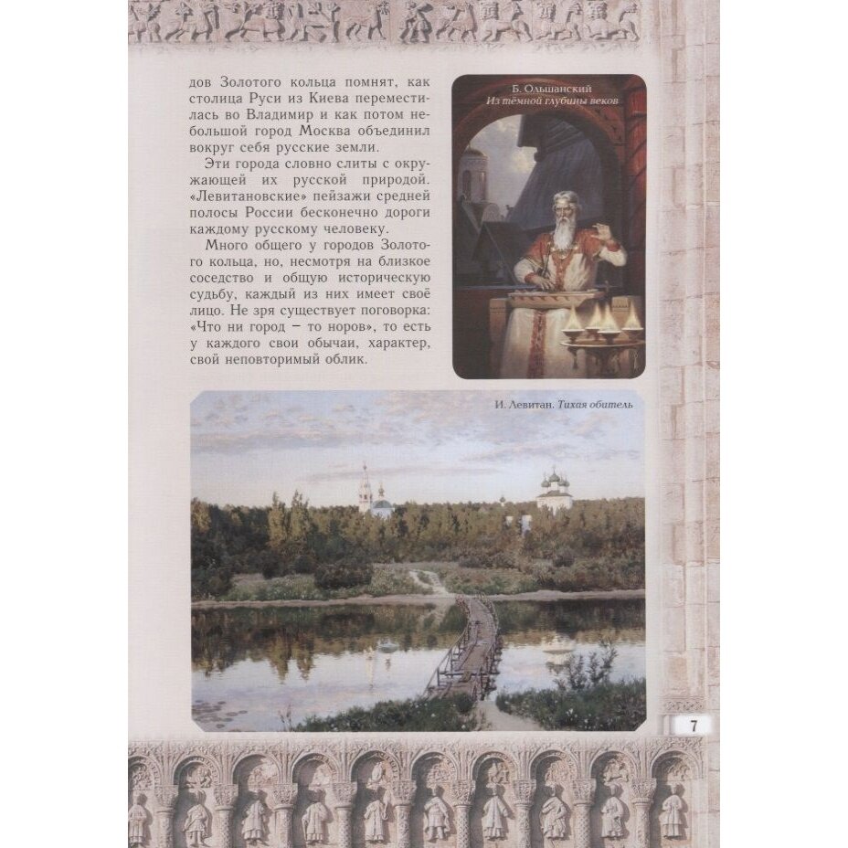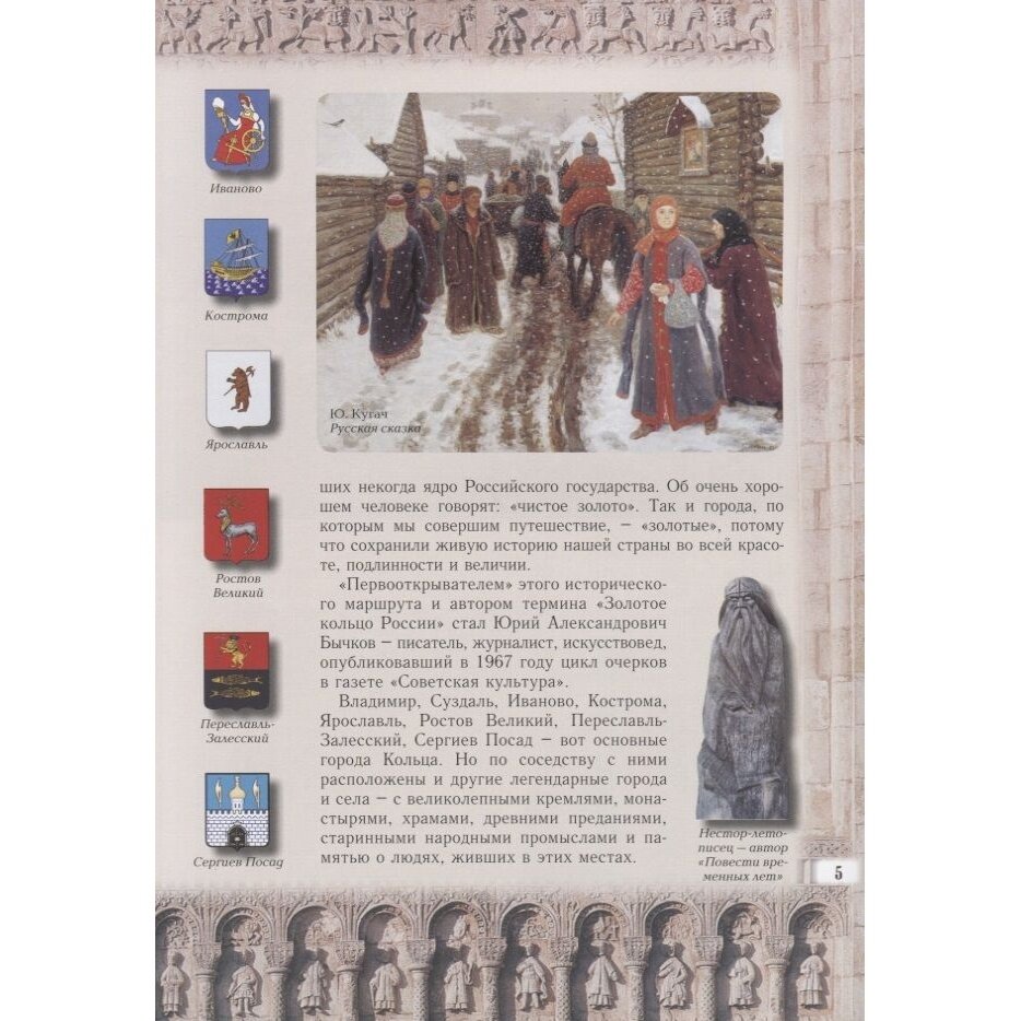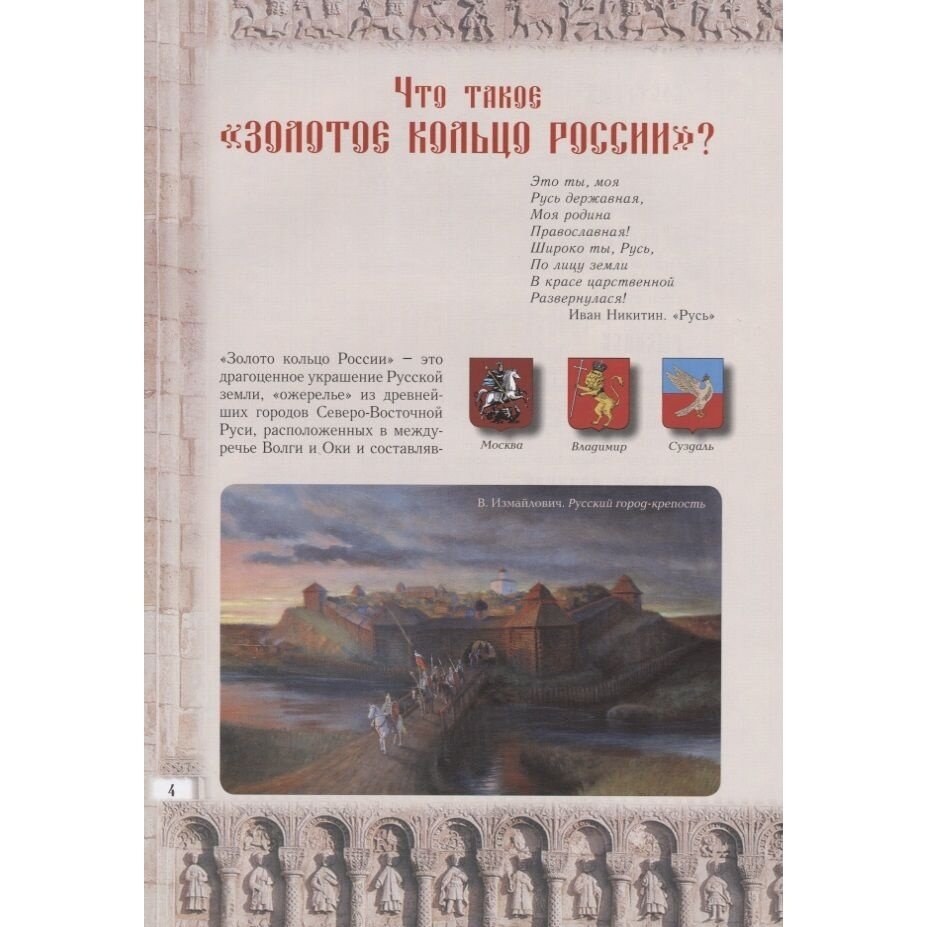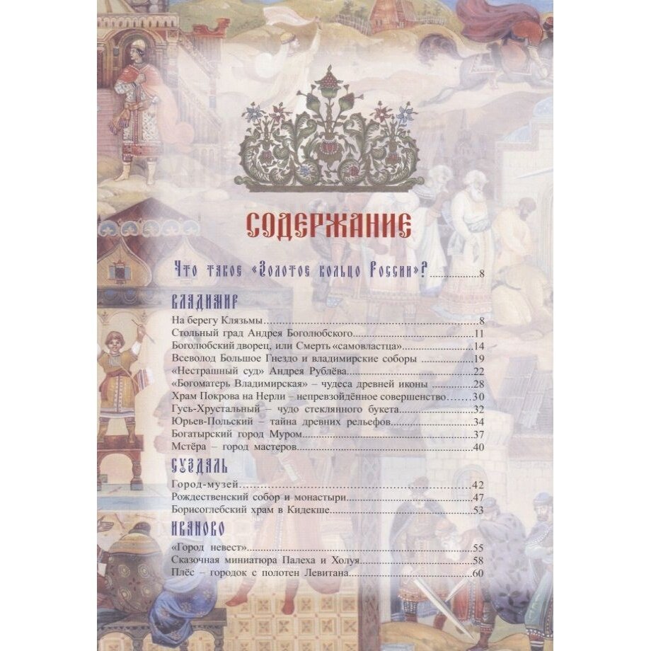 Что такое "Золотое кольцо"? Кто является автором этого термина и какие города входят в этот маршрут? Как появлялись и развивались Владимир, Суздаль, Рыбинск? Чем знамениты Мстёра, Холуй и Мышкин? На гербе какого города изображены две корзинки с вишнями? Рядом с каким городом Саврасов писал свою знаменитую картину "Грачи прилетели"? С именами каких известных людей связаны Ярославль и Александров? На эти и множество других вопросов можно найти ответы в этом замечательном издании . Эта книга обязательно понравится всем, кто любит путешествовать, кто интересуется историей Древней Руси и русской культуры. Текст очень щедро дополнен прекрасными иллюстрациями. -