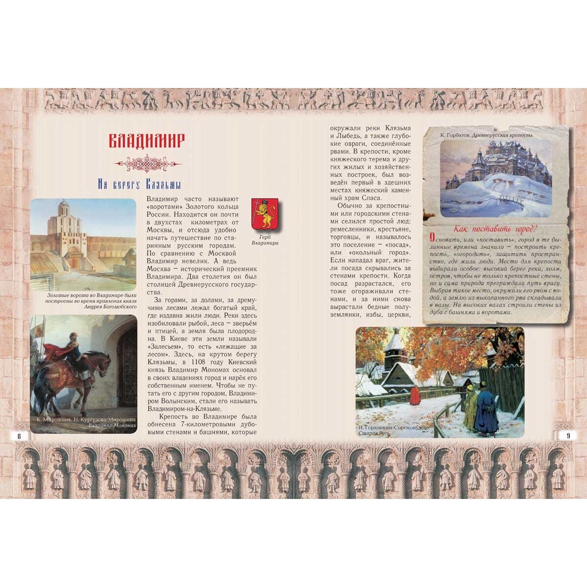 Небольшая по объему страниц книга вместила в себя огромное количество интереснейших фактов из истории первых российских городов - красивейших городов, больших и малых, с великолепными соборами и кремлями, тихими улочками, деревянными домами с кружевной резьбой и геранью на окнах, древними монастырями, левитановскими пейзажами, старинными промыслами и памятью о людях, живших в этих местах.