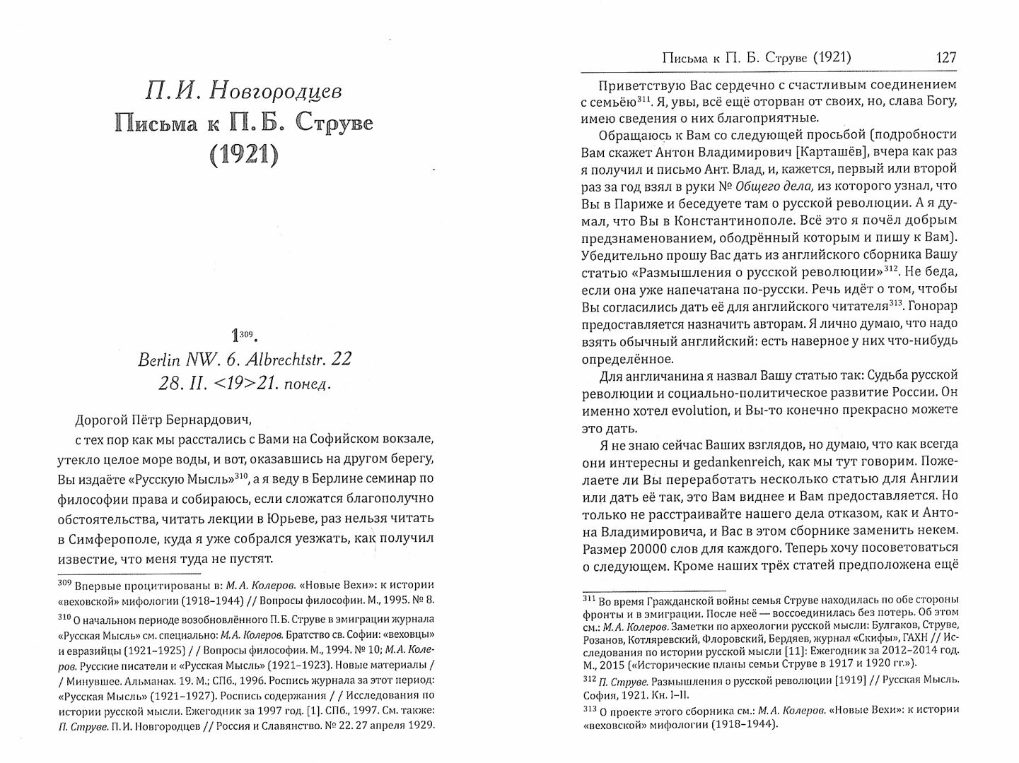 Эпистолярий главных представителей "веховской" традиции русских идейных сборников ("Проблемы идеализма" (1902), "Вехи" (1909), "Из глубины" (1918)) необычно насыщен фактологически и идейно. Классический переход части русских революционеров "от марксизма к идеализму" с редкой точностью иллюстрируется их перепиской. Кризис и раскол "веховства" в эмиграции в отношении к результатам большевистской революции, эпицентром которых стала высылка несоветской, но внешне лояльной интеллигенции из Советской России в конце 1922 года и её встреча с теми, кто оказался за границей в ходе вооружённой борьбы против большевиков,- также ярче всего документируется материалами переписки.